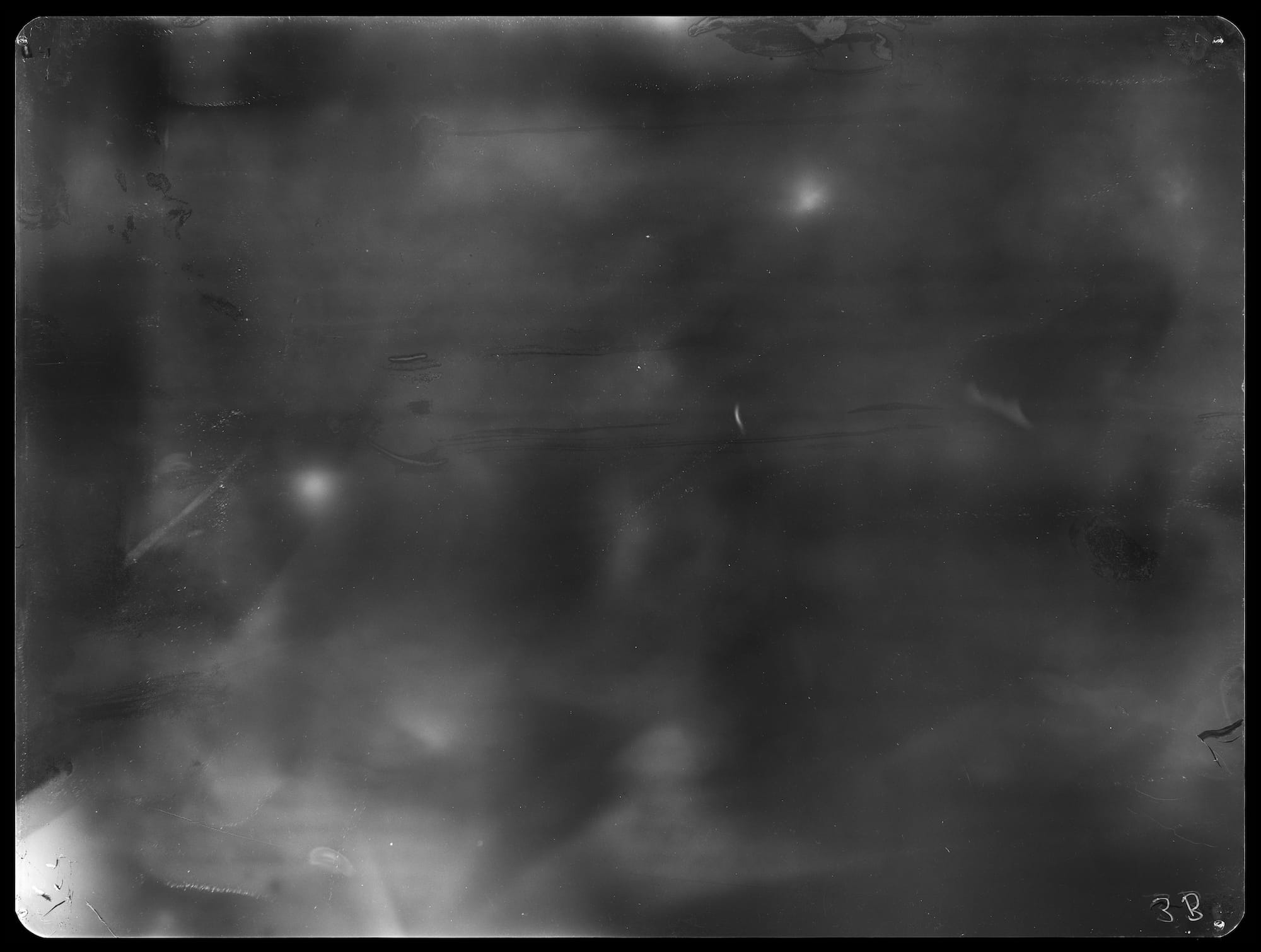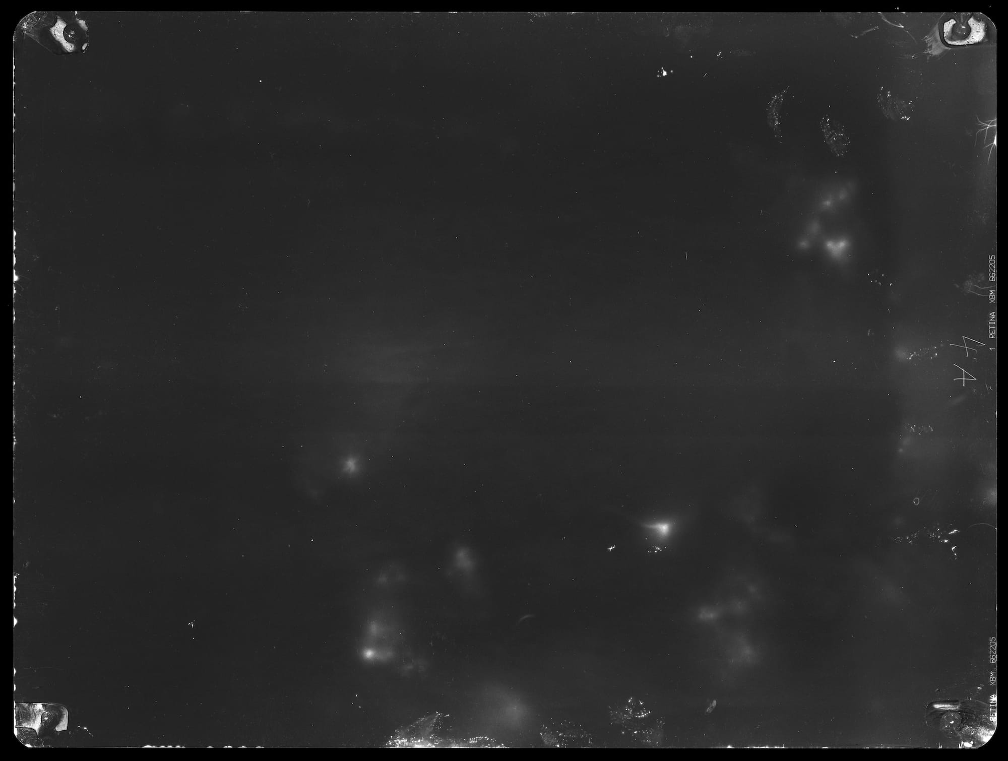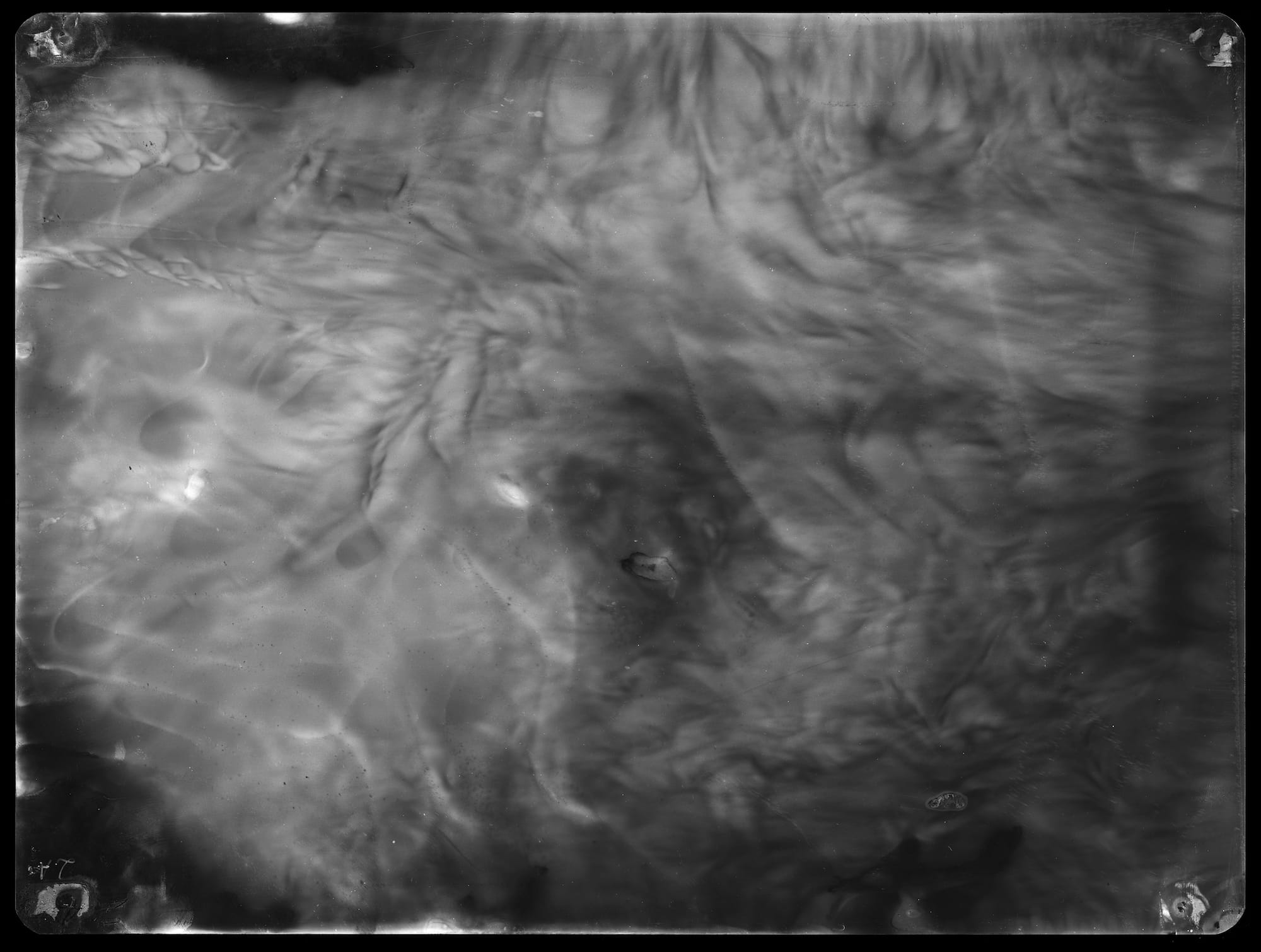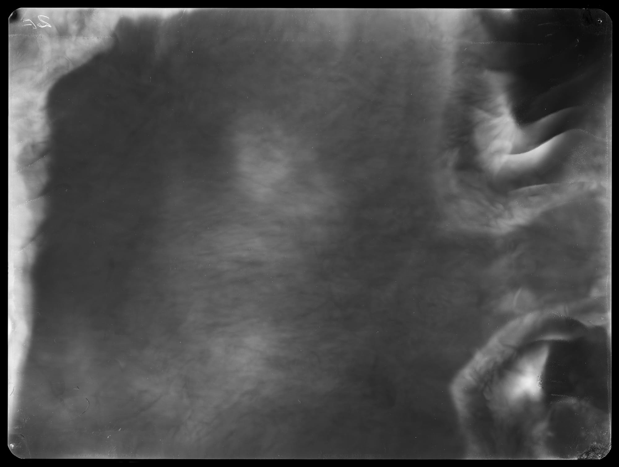 Even when it’s not being used for human X-rays, radiographic images can start to resemble body parts and bones. Much like an extended visit with Rorschach blocks, the more I looked at them, the more I could see objects or people in the abstraction. On the right wall of the first room, in “fragment of the trunk of a tree I – 6.920 µSv (17.11.08 – 21.01.09),” I thought I saw the circular outlines of ribs. Across the room, I decided “fragment of a field VI – 9.120 µSv (07.05.09 – 21.07.09)” was a cheetah or a leopard. I made out close-set eyes, a black, round nose, and whiskers.