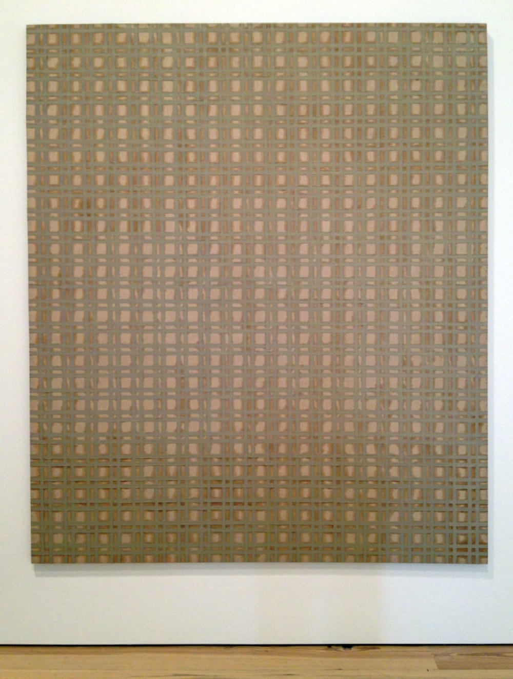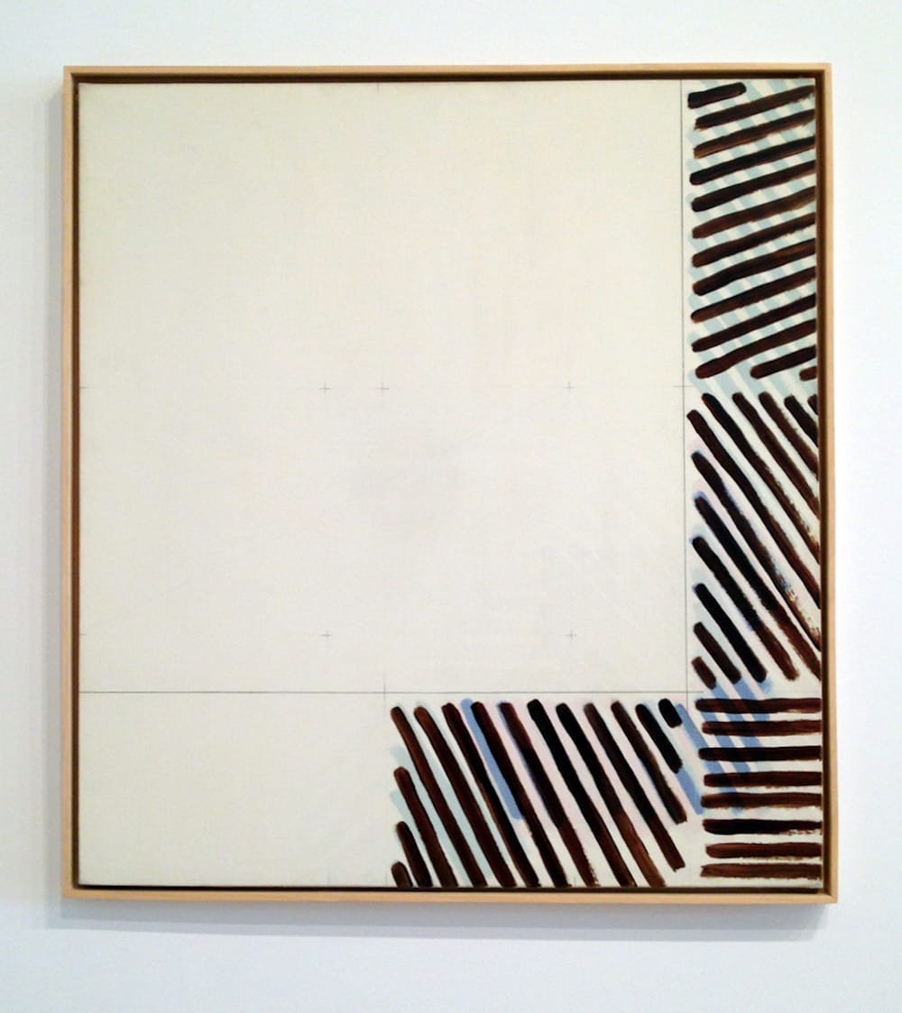 No artist exemplifies that quality better than the late French painter Martin Barré, whose queasily vacant striped canvases were expertly parsed by Gwenaël Kerlidou in Hyperallergic last month. His “74-75-C-113×105” (1974–75), a J-shape composed of diagonal and horizontal stripes along the right and bottom edges, leaving the rest of the surface blank, hangs in a corner beside a juicily painted monochromatic grid, “The Production of an Unevenly Distributed Surplus Results from the Facticity of Format and Ground” (2006) by Cheyney Thompson, who brought Barré’s work to the attention of the Wagners.
