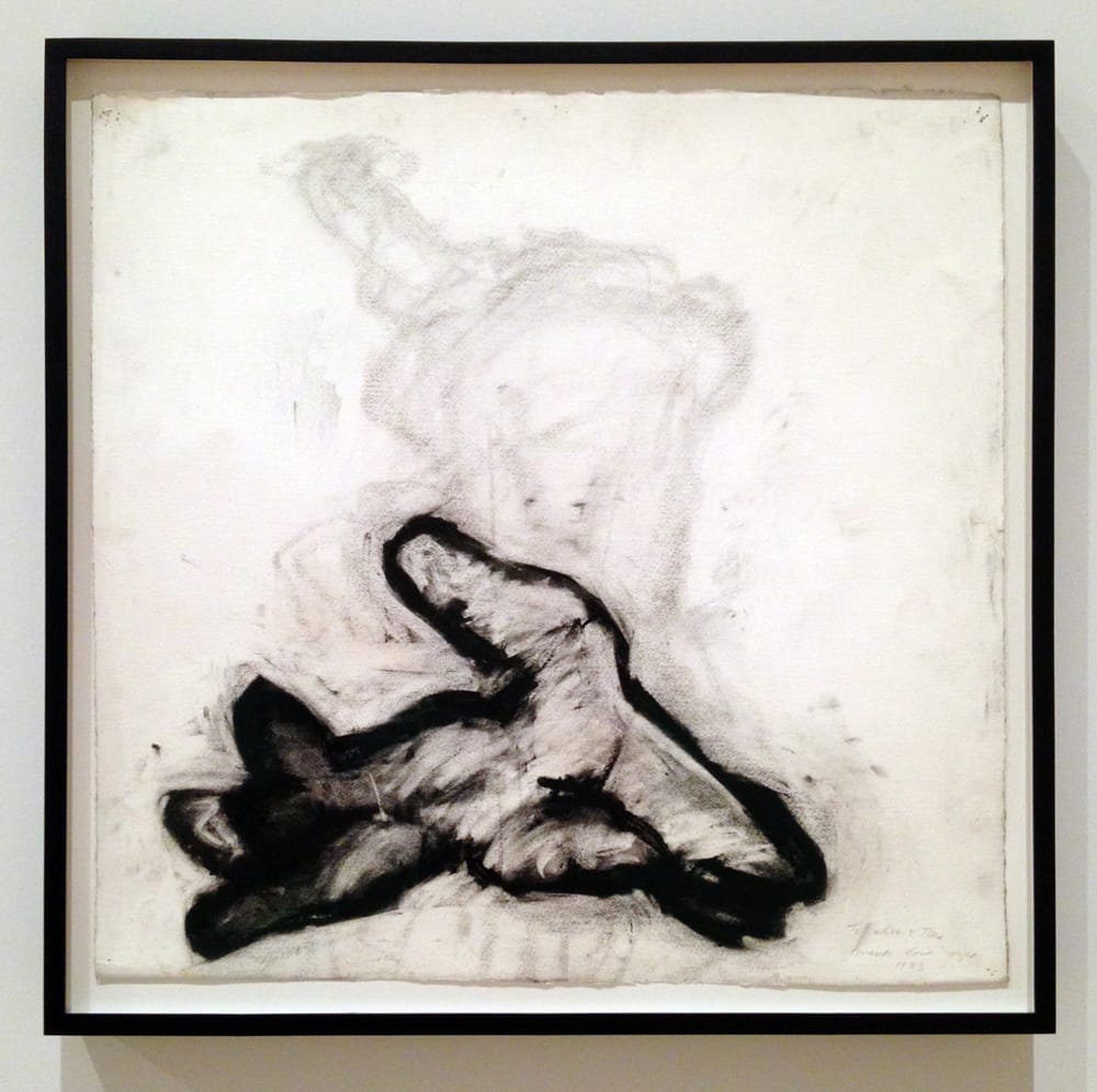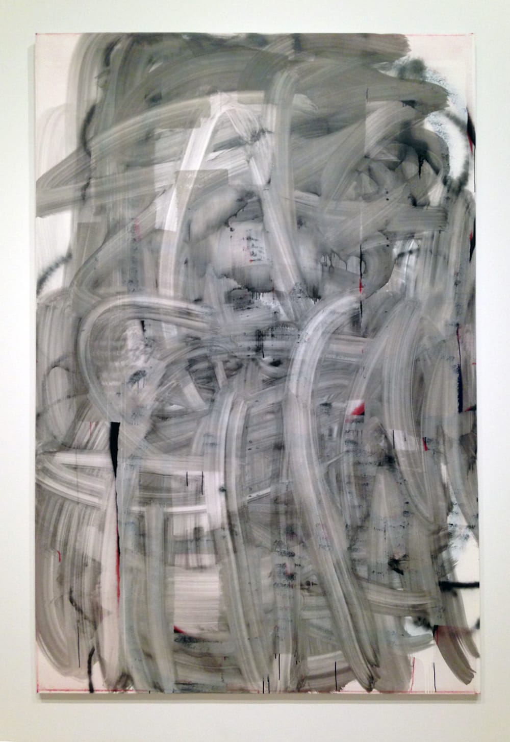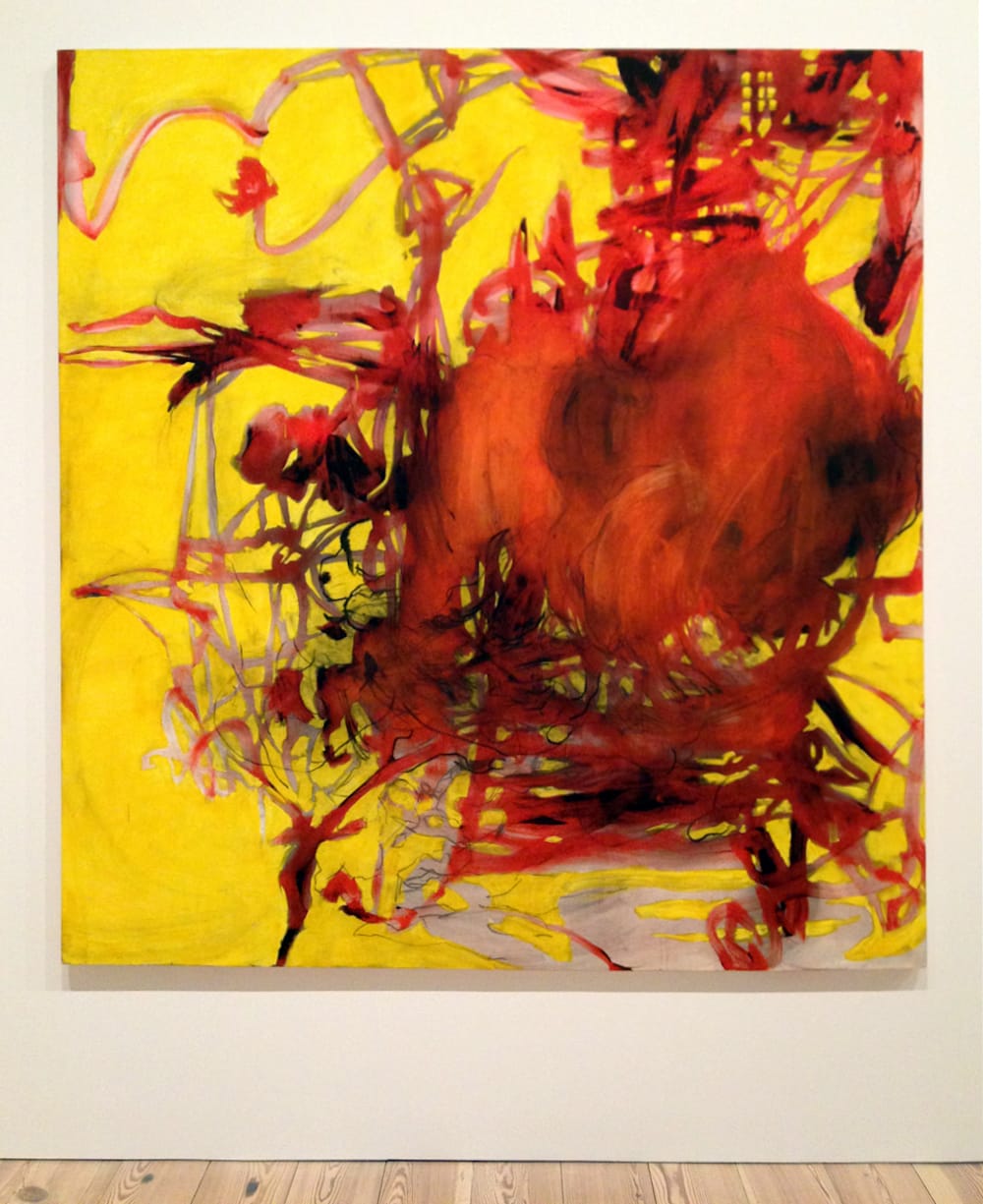 The first category includes a striking head shot by Diane Arbus, “Puerto Rican woman with a beauty mark, N.Y.C.” (1965), an indomitable-looking woman with thick masses of black hair, painted eyebrows and misapplied lipstick. Other compelling works include Steven Parrino’s untitled, aggressively materialist painting in black enamel, whose canvas is all but pulled off its stretchers, turning it into a sculptural relief; Joyce Pensato’s charcoal drawing “Reclining Glove” (1983), which appears to belong to her signature appropriations of Mickey Mouse; and Charline Von Heyl’s “Boogey” (2004), a red and yellow abstraction in acrylic, oil, and charcoal, which is the show’s poster image. Interestingly, the painting, at least to my eye, looks tangled and harsh in reproduction, not at all indicative of how it feels in person, where the coloring and texture are soft and sumptuous. A real knockout.