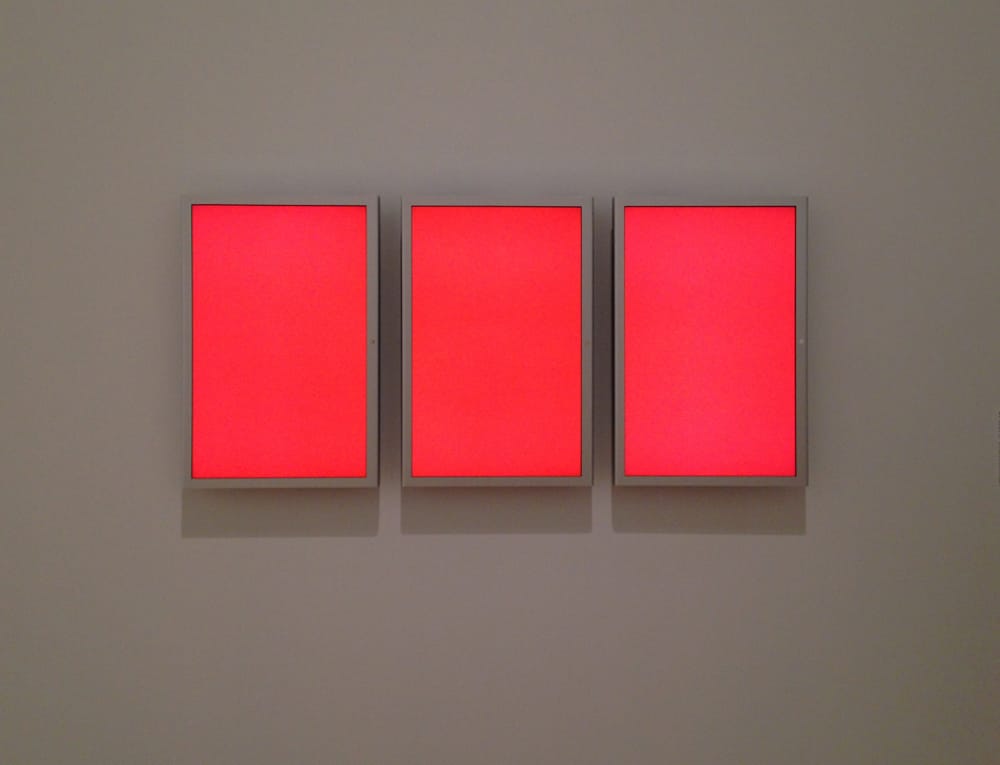 Otherwise, the show is based mostly in the personal and the formal, with the exception of a stunning untitled photograph from 1989 by David Wojnarowicz, for whom the personal was nothing if not political, depicting a pair of bandaged hands holding a bird’s nest that’s as spiky as a crown of thorns. But within that range, the works run from the ultra-reductive (Hito Steyerl’s “Red Alert,” 2007, a looped three-channel digital video presenting the color red, period) to the ultra-decorative (Marc-Camille Chaimowicz’s “Basel Sequence,” 2011, an acrylic painting on five plywood panels mimicking wallpaper designs).