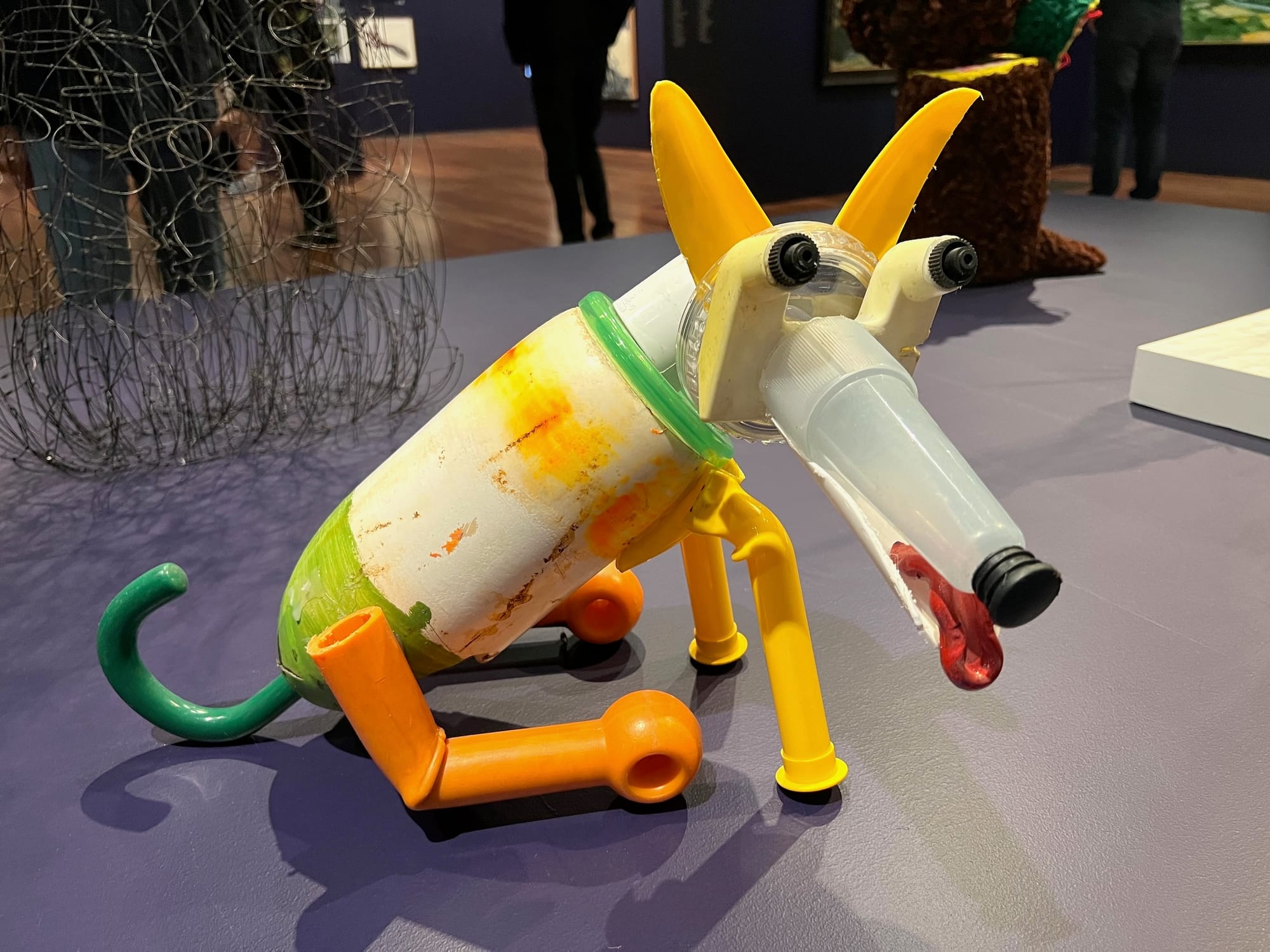 Sculpture, including works presented on pedestals and wall reliefs, is sprinkled throughout the exhibition. Jerry Ross Barrish’s “Rescue(d) Dog” (2021), crafted out of plastic scraps, industrial hot glue, and screws, stands out for its funky and charming use of repurposed materials. “Bountiful” (2023), a relief by Jack Mattingly, projects a vibe of environmental doom looming under three floating skulls radiating human legs.