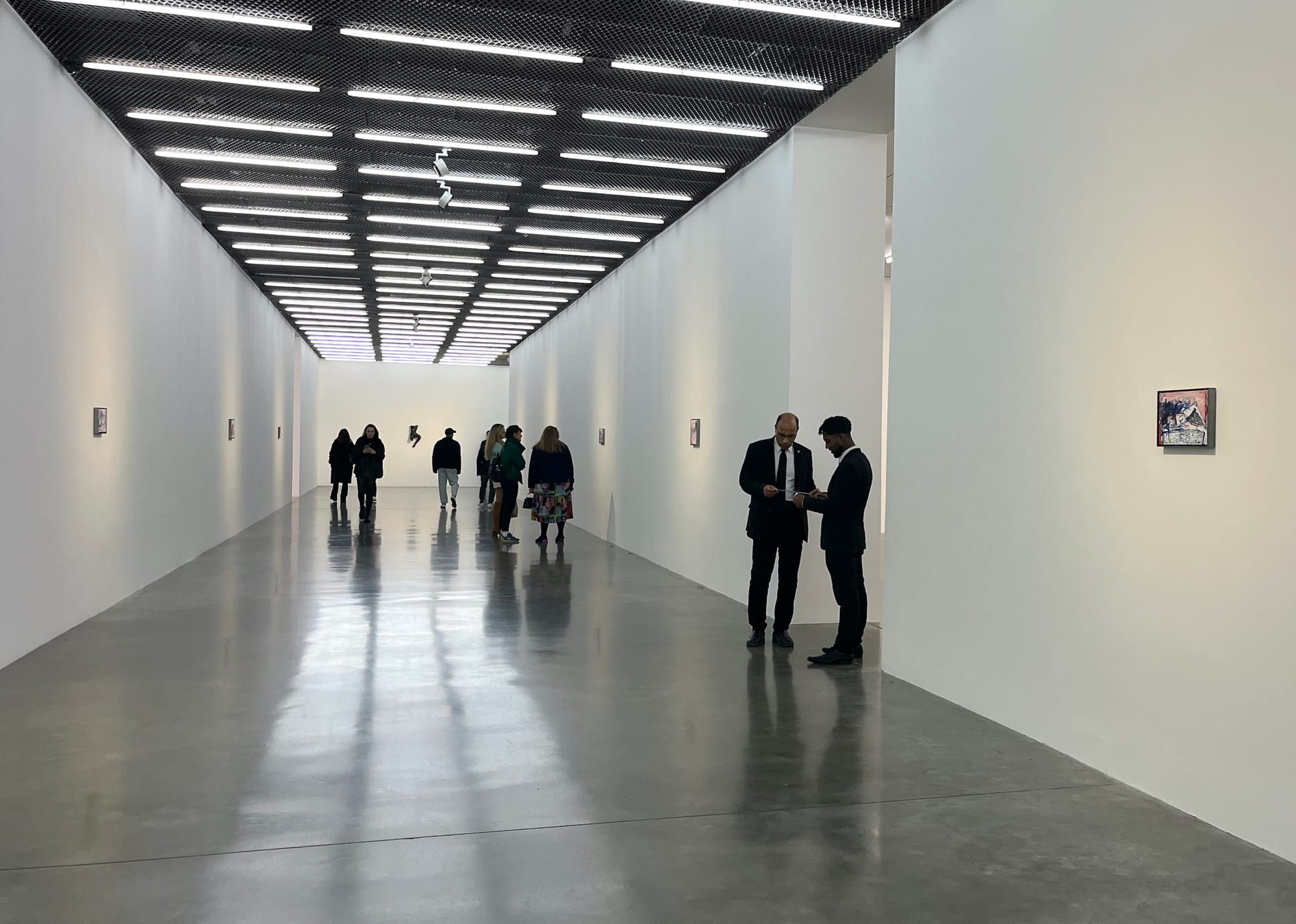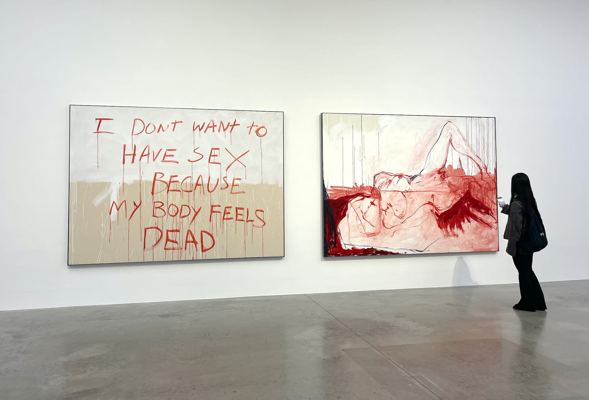 The exhibition opens with a long hallway of 13 small acrylic works on canvas, most depicting Tracey in her bed, alone or with another person, and often with a cat perched nearby. This hallway flickers as a preamble, dimly lighting the way to the first room, where the large paintings explode.