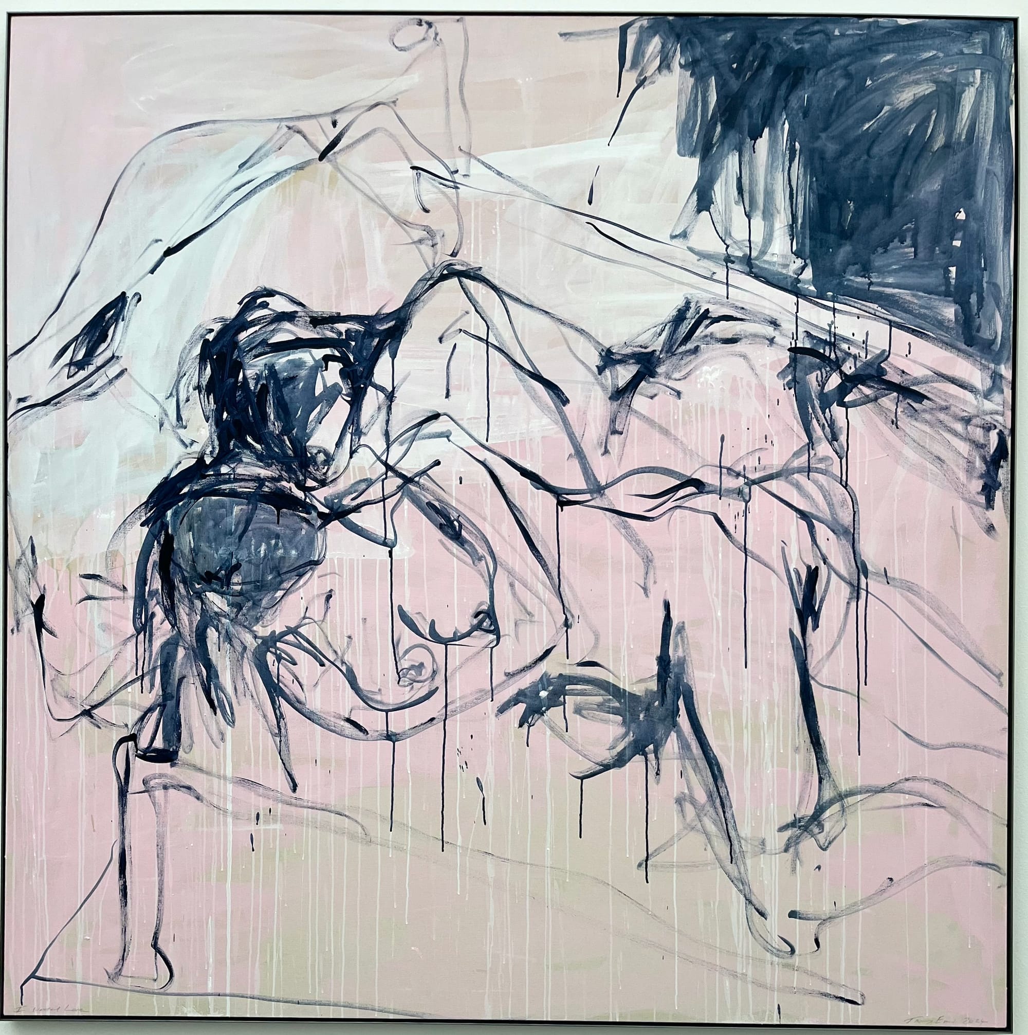 Emin's 2019 show included a room-sized installation of photographs of her fitfully trying to sleep; 50 huge prints showed closeups of the artist in bed. This theme, which began with her infamous 1998 “My Bed” installation, continues here in works such as “More Love Than I Can Remember.” Using only blue and black, she renders the sprawl of her body in bed, a cat sitting on an outlined dresser to the side. The thin paint fidgets on exposed canvas, while a series of drips near the bottom trickle down like an echo of time passing in the darkness. The figure is naked with legs splayed, as if dreaming about a time when physical connection was less fraught.