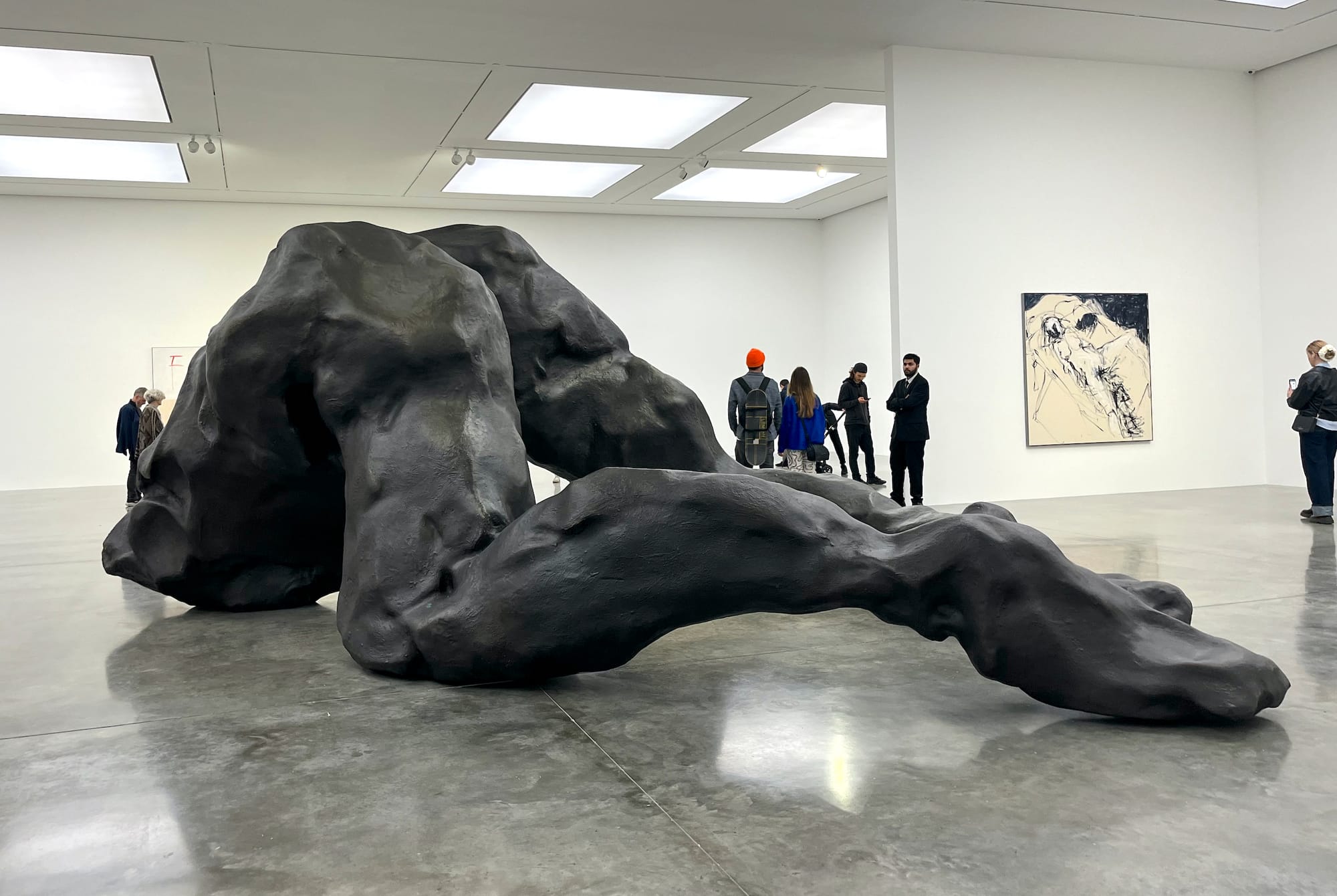 “Cruel” appears to be a study for an enormous bronze sculpture, “I Followed You To the End,” in the center of the room, which further abstracts the pose into a headless, elongated torso, buttock in the air, legs extended. Prayerful, exasperated and cheeky all at once, the sculpture blithely turns the serious history of monumental bronzes by male sculptors such as Auguste Rodin into a crumpled human tissue. This inversion fuels Emin’s entire oeuvre as she insists that our interior worlds, full of fears and vulnerability, are equal in valor to externalized heroism.