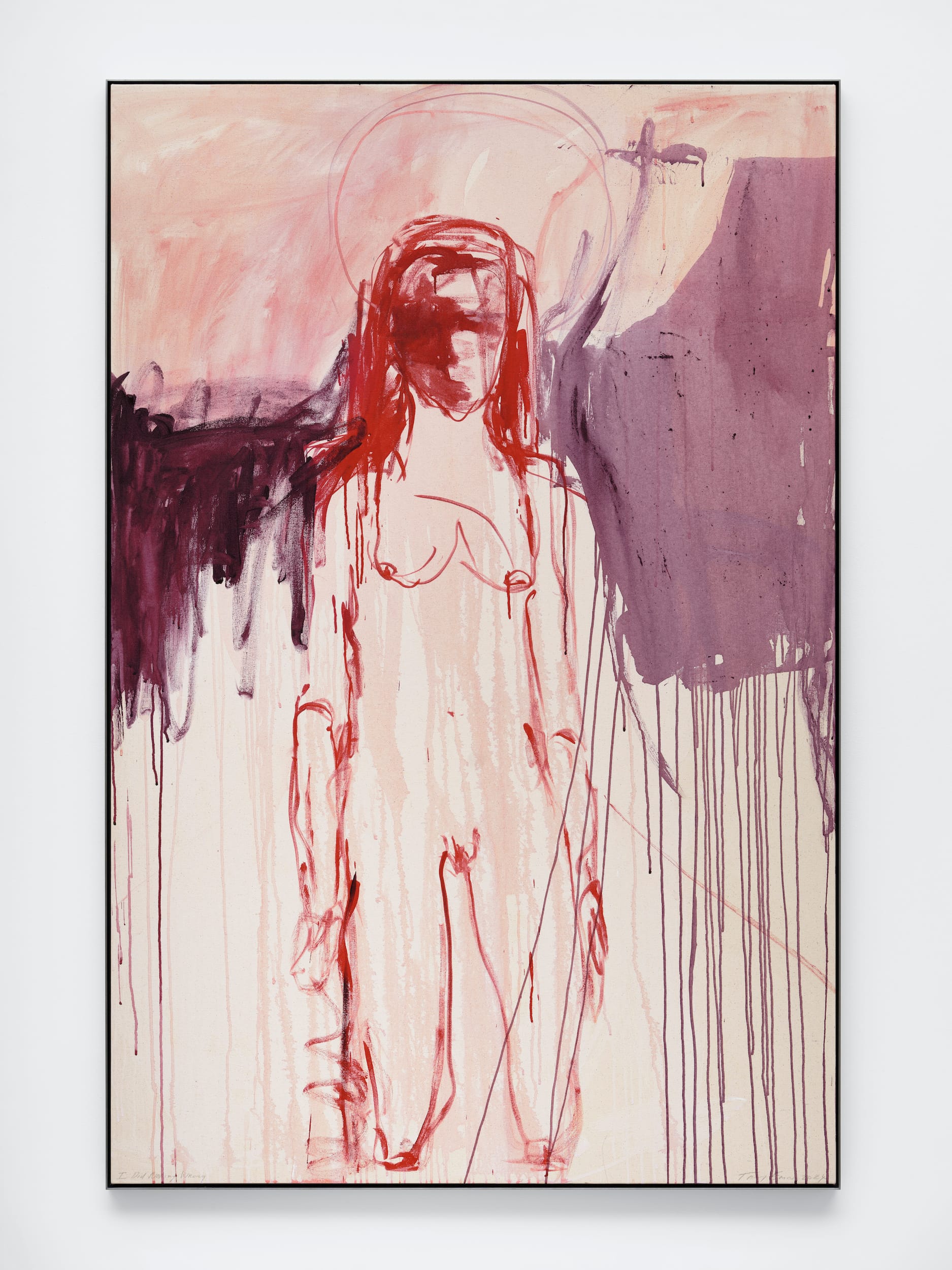 Despite the museum scale and blue-chip quality of the 40 paintings and two sculptures on view (all 2024), this exhibition feels both more insistent and more intimate than the previous one. Emin is fueled by a need to excavate her interior landscape, to make the things we don’t easily find a means of expressing more approachable. She brings pain to the surface, not via the theatricality of some artists but through a serialized secretion, an oozing of emotion from canvas to canvas that allows nuances to emerge. The gestural figures float in elegant compositions, creating a strangely beautiful balancing act.