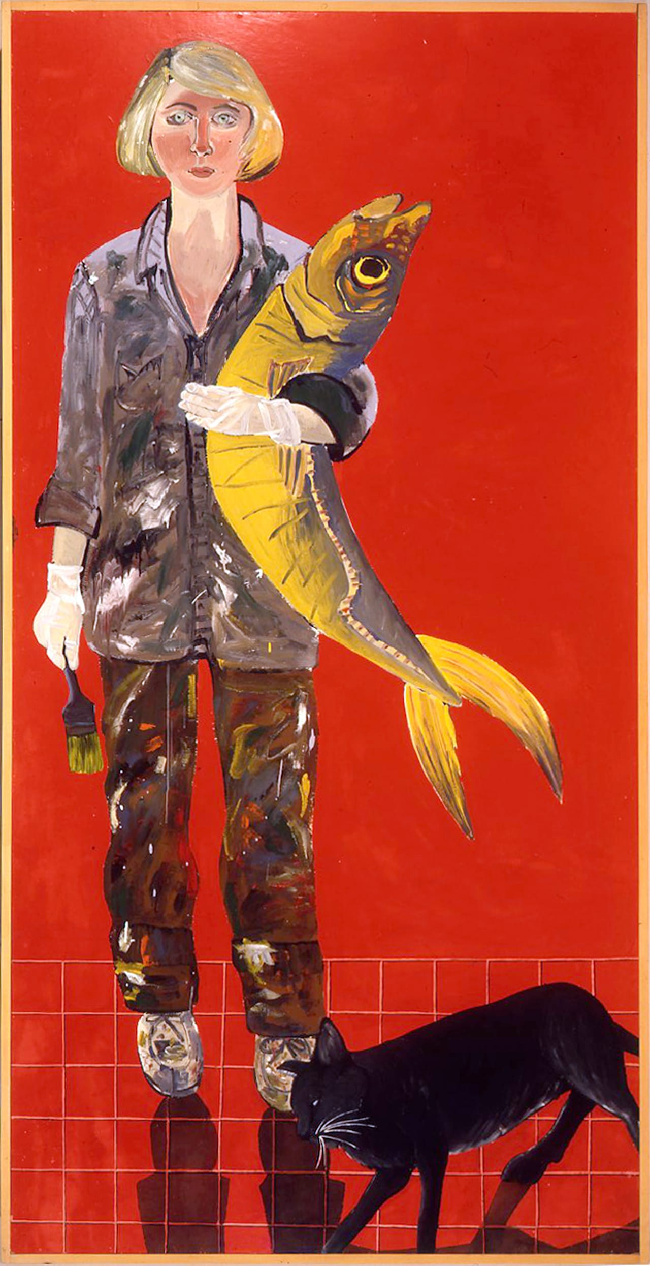 The stunning “Self-Portrait with Fish and Cat” uses the same faux reflection; here, the figure of Brown hovers over a gridded red floor. The flat, monochrome background is offset by the painterliness of Brown’s paint-splattered shirt, pants, and shoes, which create a vertical expressionist field in the midst of the larger composition. The background is a glossy oxblood hue that resembles the porcelain glazes she may have seen on Chinese pottery at the de Young, though she was also exposed to the work of numerous Bay Area and California-based ceramicists and painters in the ‘50s, ‘60s, and ‘70s, including Roy de Forest, Jeremy Anderson, and Ken Price, many of whom were using vivid color as an integral part of their art. This view of Brown as artist counterpoints the more circumspect view in “Portrait of a Chair”: where she was once the subject in absentia, she is now primary, her identity as an artist prominently on display.