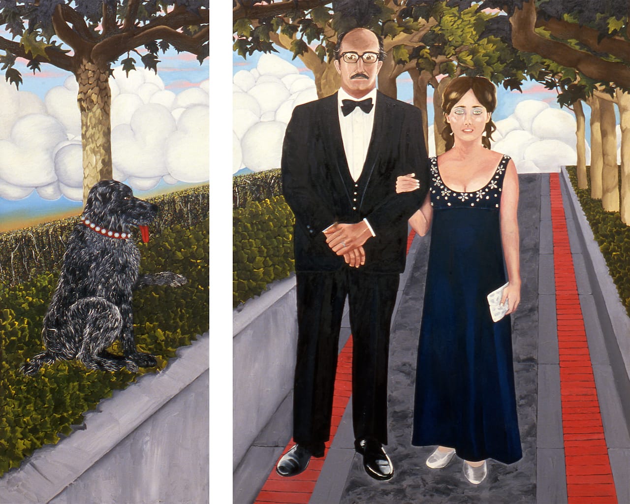 Her painting “Gordon, Joan and Rufus in Front of S.F. Opera House,” from 1969, reflects this change. The painting is a diptych, and Brown worked from a photograph of herself and her second husband. In the larger of the two panels, the couple stands on a sidewalk and faces the viewer, with two rows of trees receding into the distance behind them. The smaller panel depicts the dog Rufus in the bushes, on the outskirts of the primary scene (Rufus doesn’t appear in the photograph). The painting’s strong rectilinear elements disrupt one another: horizontal rows of bricks against the verticality of tree trunks; the strong parallel lines of red sidewalk blocks against the abrupt vertical break between the two canvases. The almost vertiginous illusion of distance is fractured, however, by the flatness of the bulbous, cartoony clouds, the mottling of the bushes and ground cover, and the frontal placement of the figures of Joan and Gordon against the picture plane, as though collaged onto this unreal setting. Rufus, meanwhile, sits obediently in profile, alone in his own panel.