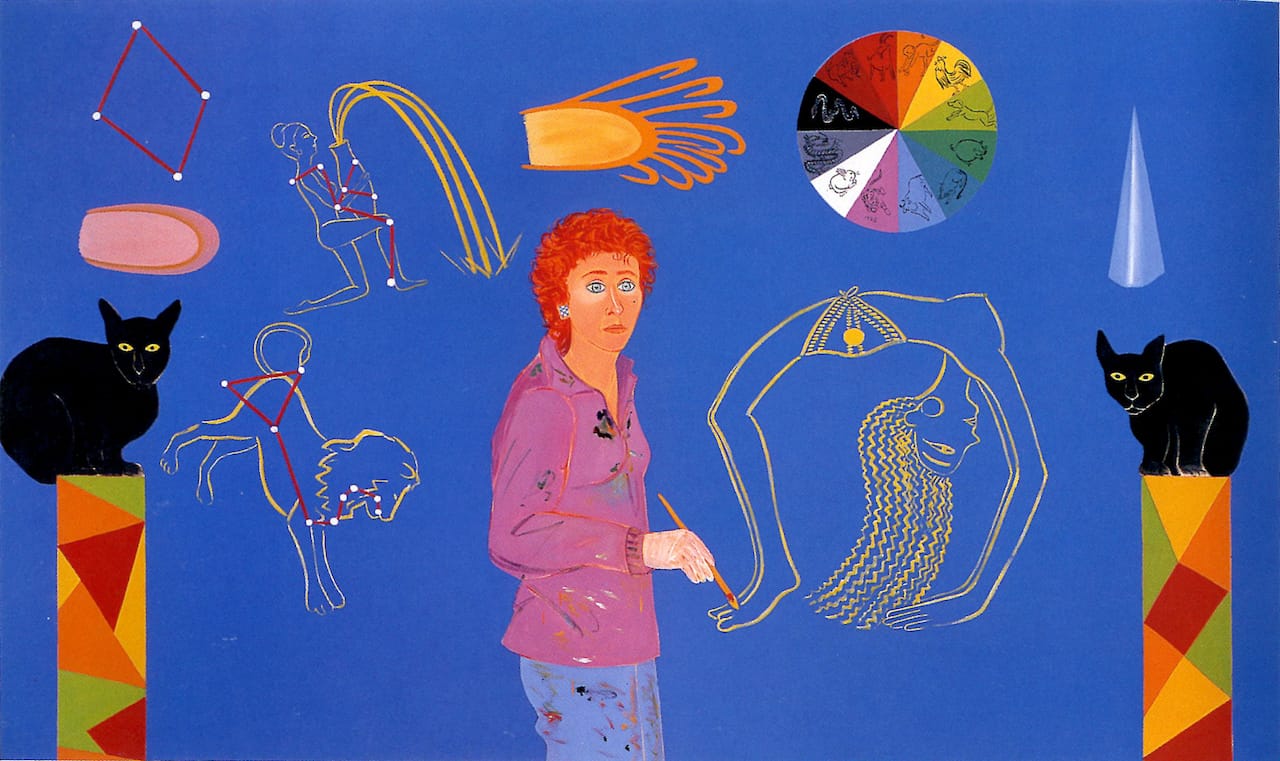 In “Summer Solstice,” from 1982, she resides in the night sky, a constellation in the background, and is literally clothed in Sanskrit; the painting provides no hints about the meaning of the ancient writing, an indication perhaps that its significance is personal and that this journey is meant for her alone. The ten-foot-long painting “Year of the Tiger,” from 1983, incorporates all of Brown’s impulses. A grouping of heavenly constellations, a color wheel containing astrological symbols, and Eastern-inspired forms are arranged neatly in the blue background and are bordered on either side by twin pillars and two black cats who look out at the viewer. Brown herself stands in the middle, also turned toward the viewer, paintbrush in hand: she is inextricable from the scene, both within it and outside of it, its creator and its subject.