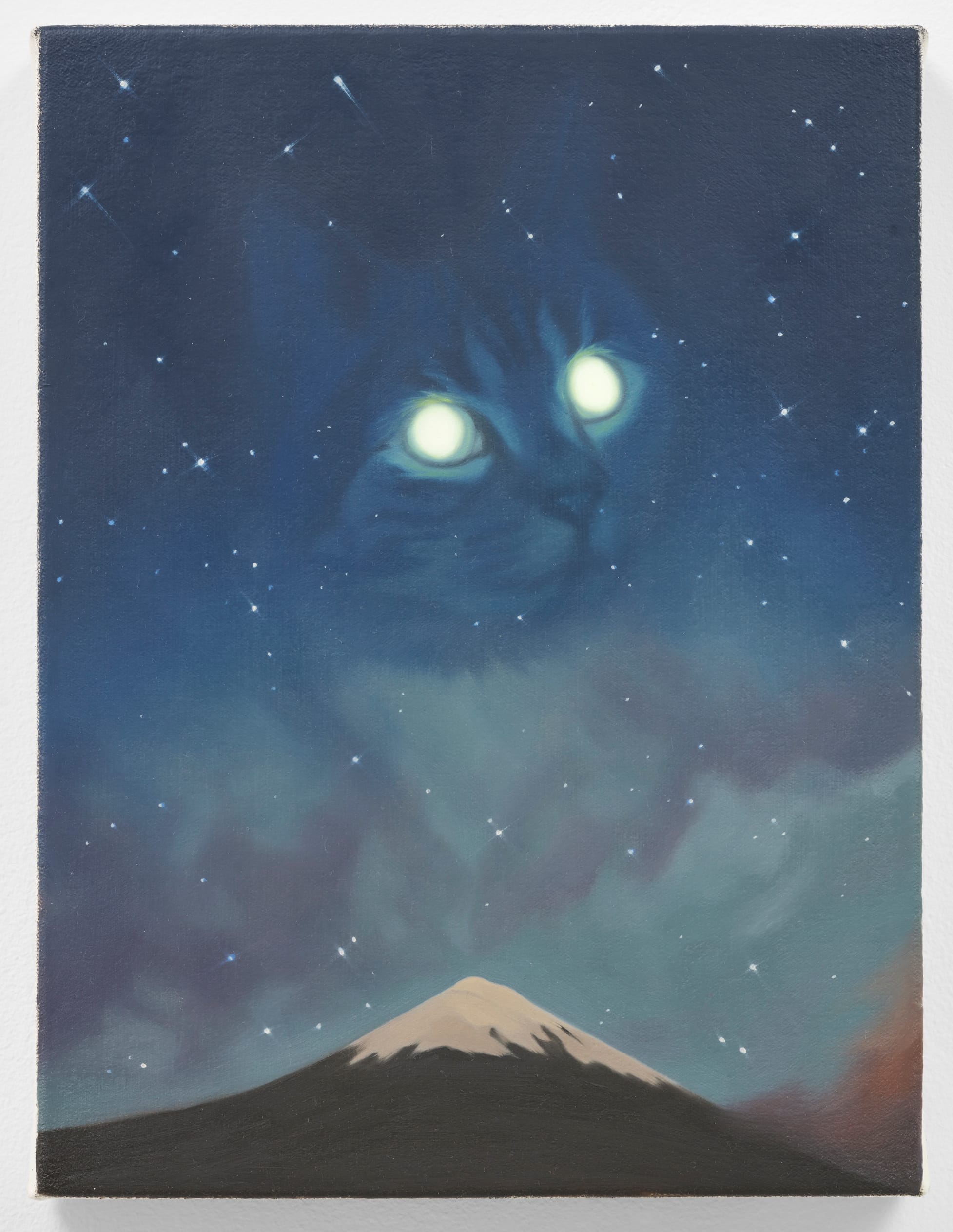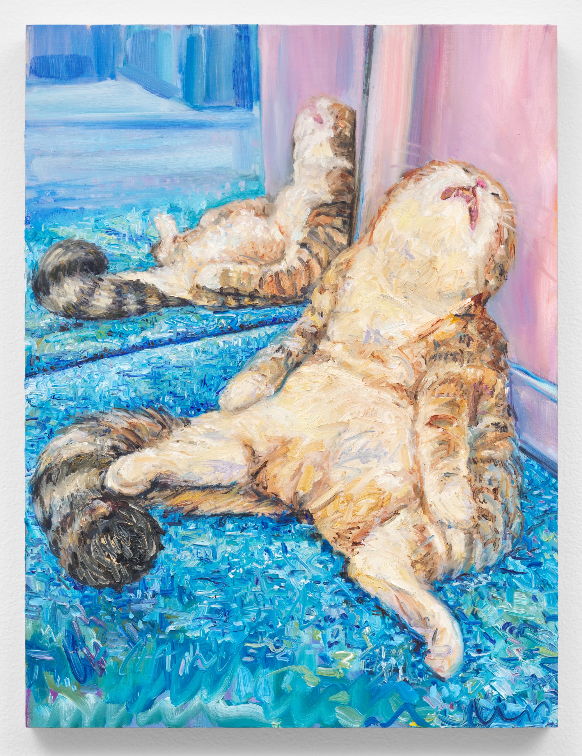 In both paintings — and in almost every work in the exhibition — cats display the utmost confidence, a holier-than-thou attitude that any cat parent will likely recognize in their own beloved pet. The animals take up space with dignity, suggesting that the oddity is not their presence but that of a human being.