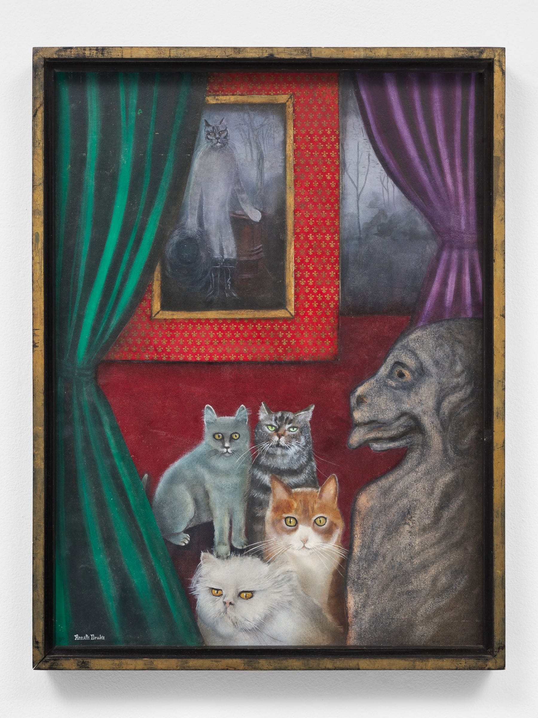 Almost all of the works are by living artists, with a few exceptions, including an Andy Warhol print that presents perhaps the exhibition's most straightforward depiction of a cat. A painting by Renate Druks — movie star, director, and avid painter of cats — titled "Male Cat Club" (1980) evokes the visual language of the Hollywood Golden Age she lived through. The haunting image is full of gilding, velvet draping, and is punctuated by the vibrant hue of the red carpet. The setting looks like a movie or stage set and the outdoor views visible in the background evoke the dreary exteriors of film noir.