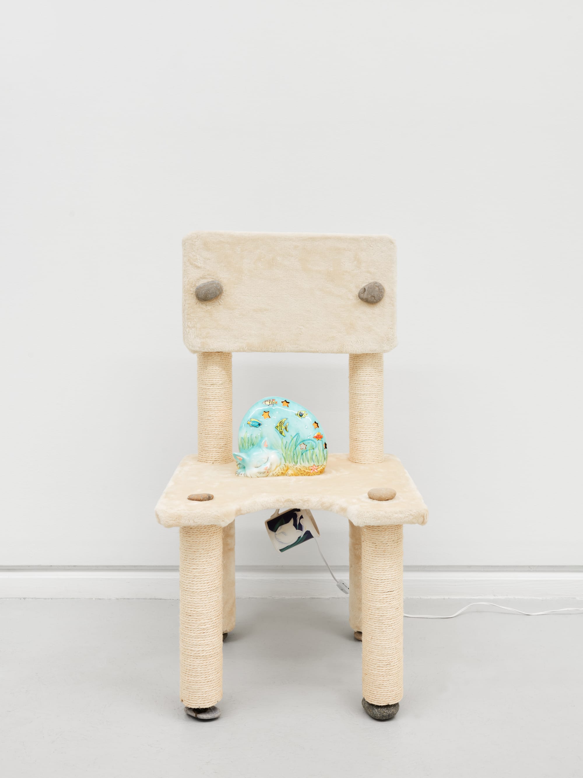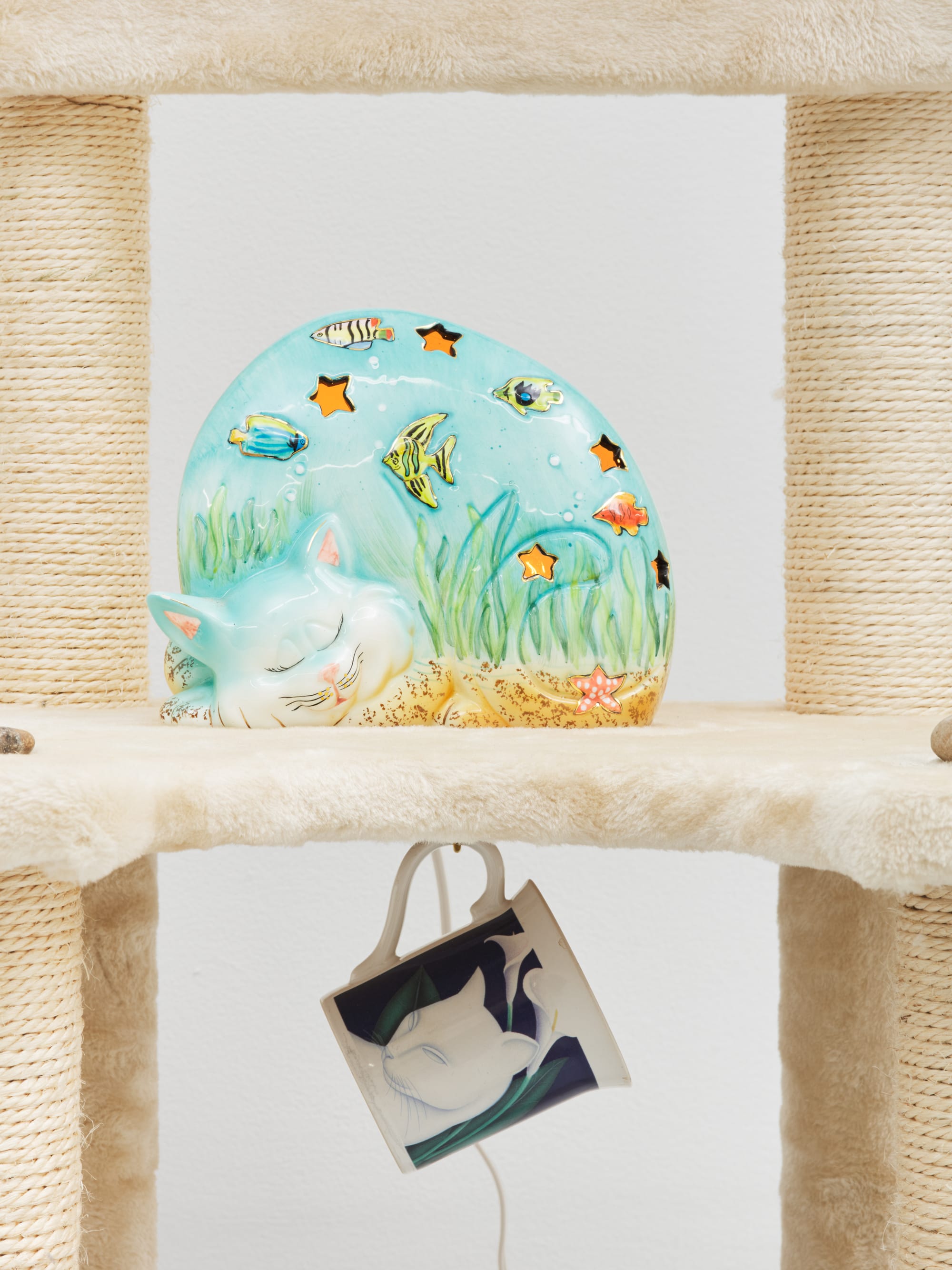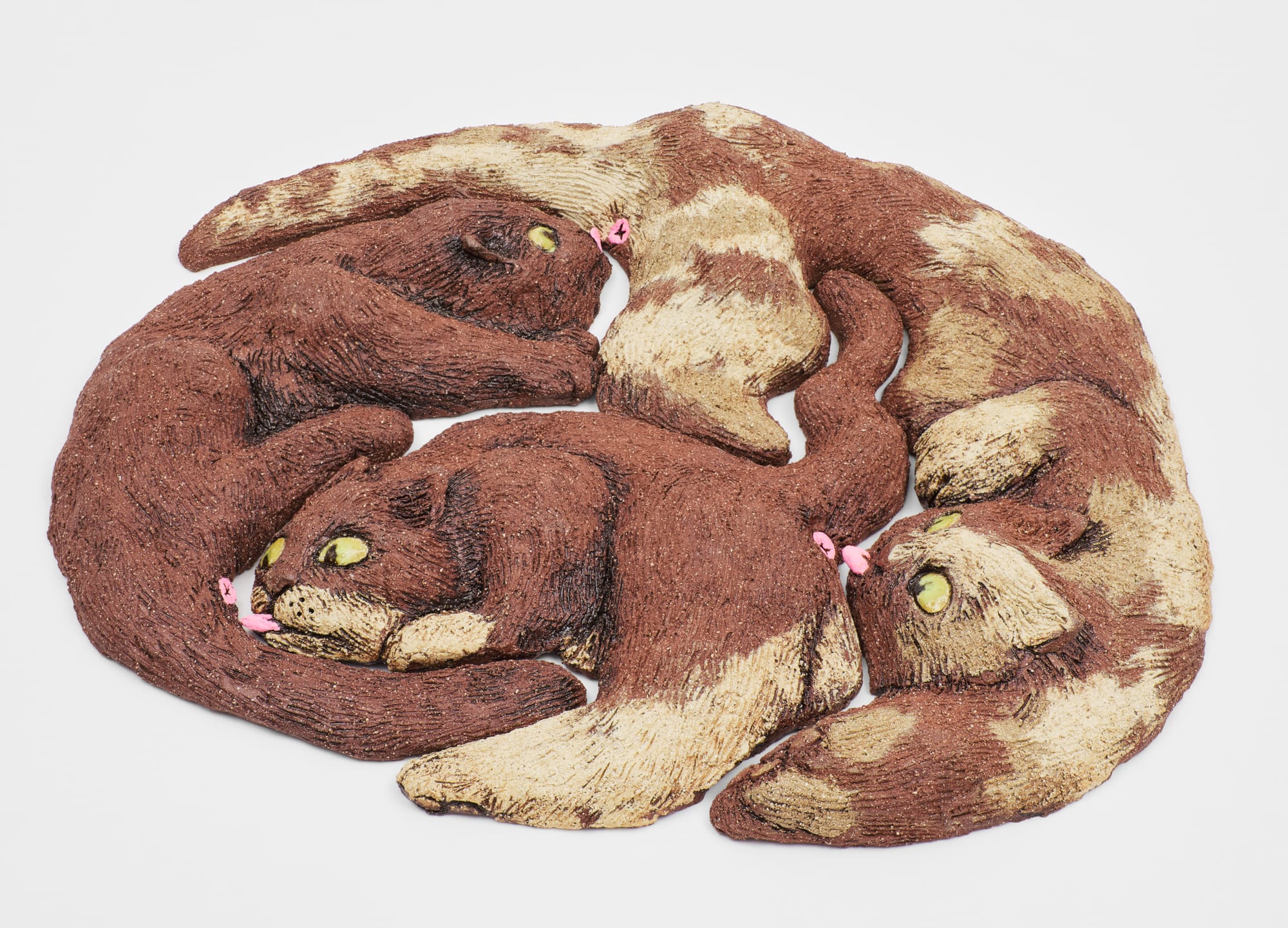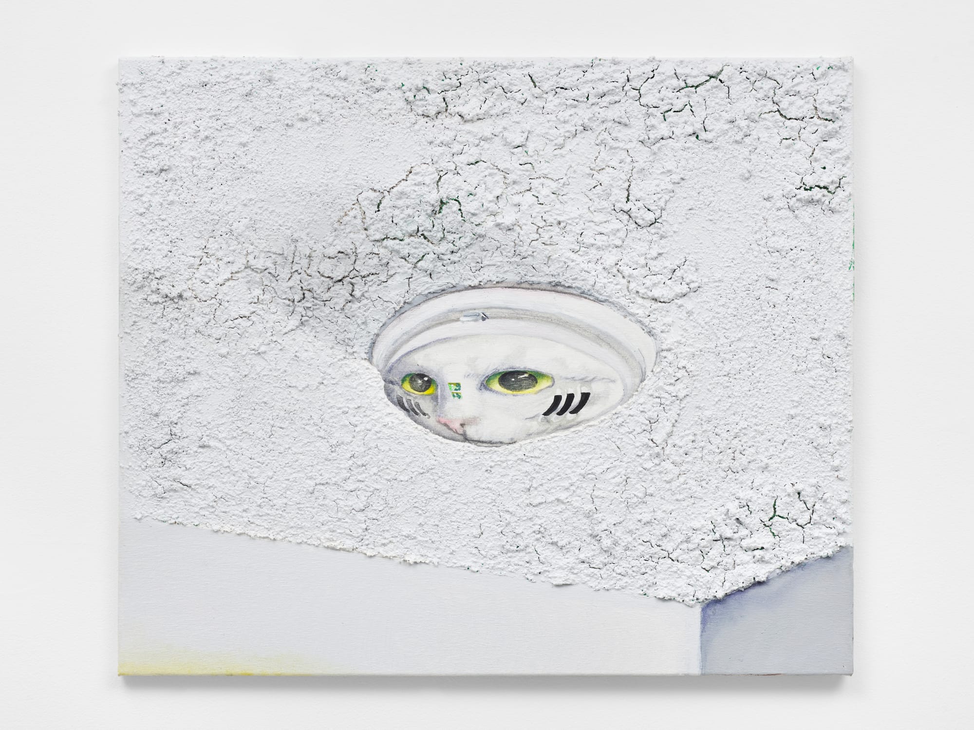 Two pieces tap into the idiosyncratic quirkiness of our feline companions: "Kitty Infinity" (2022), a wall relief depicting three cats "intertwined in an endless circle of cleaning each other's bums," and Philip Hinge's "keep me safe," a bizarre and enthralling three-dimensional painting of a cat disguised as a fire detector, complete with a popcorn ceiling made of cat litter.