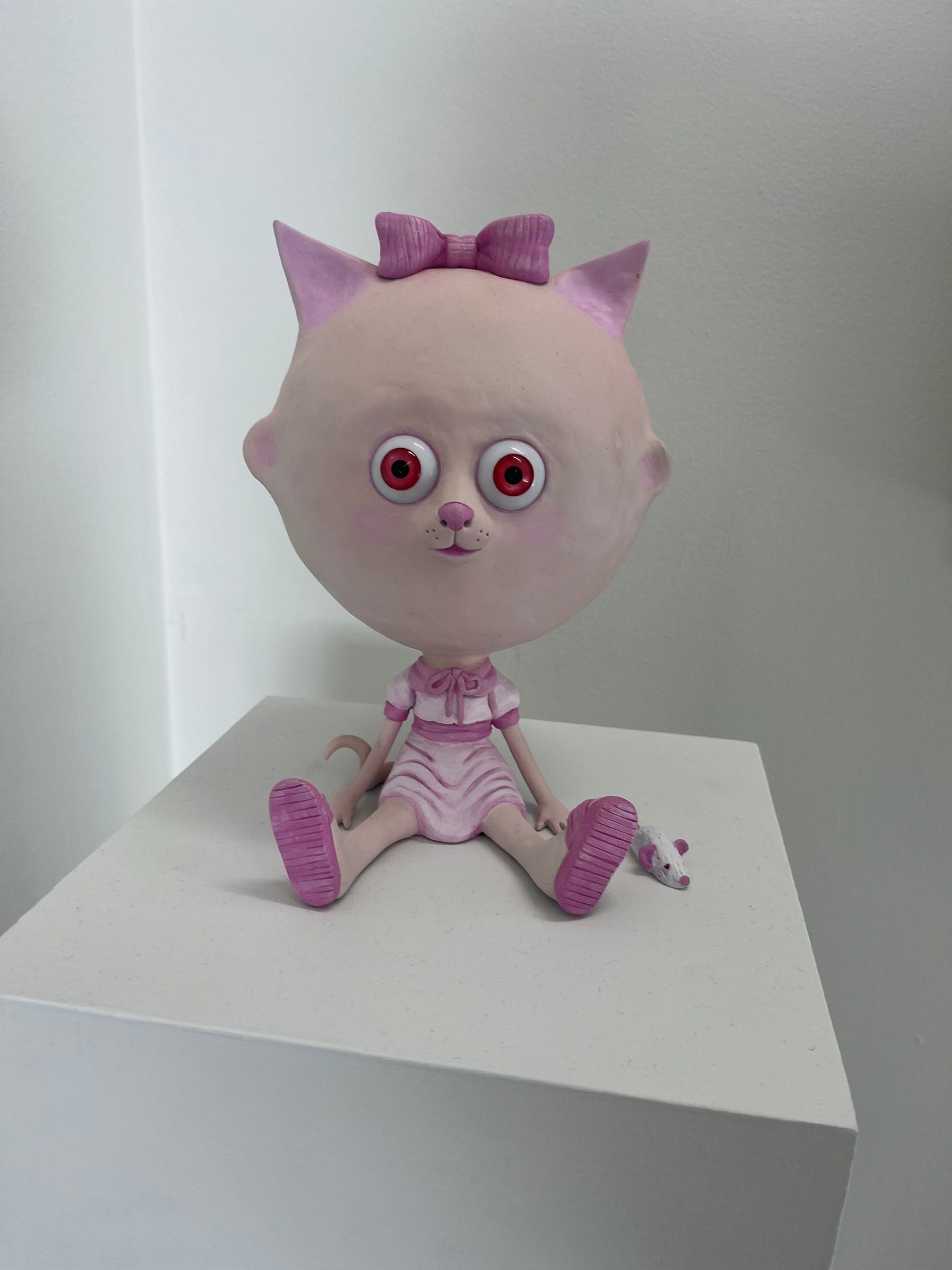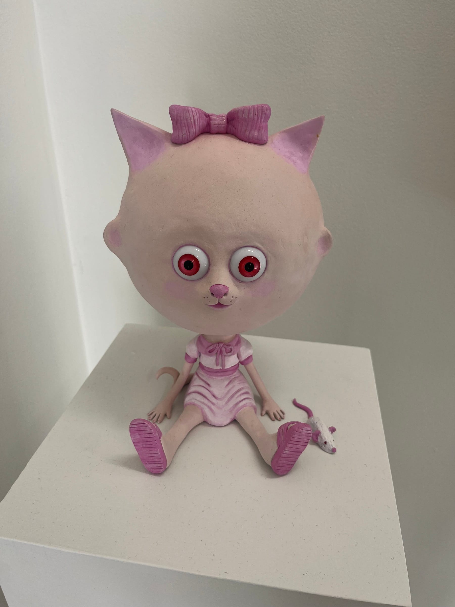 Johanna Strobel's sculpture commemorates feline hero Félicette, the first cat in space, and Abby Lloyd's "Enchanted Cat Girl" (2019), a pink anthropomorphic foam figure, assumes different facial expressions depending on where the viewer stands. Lloyd has impressively managed to keep the sculpture upright despite the figure's enormous head.