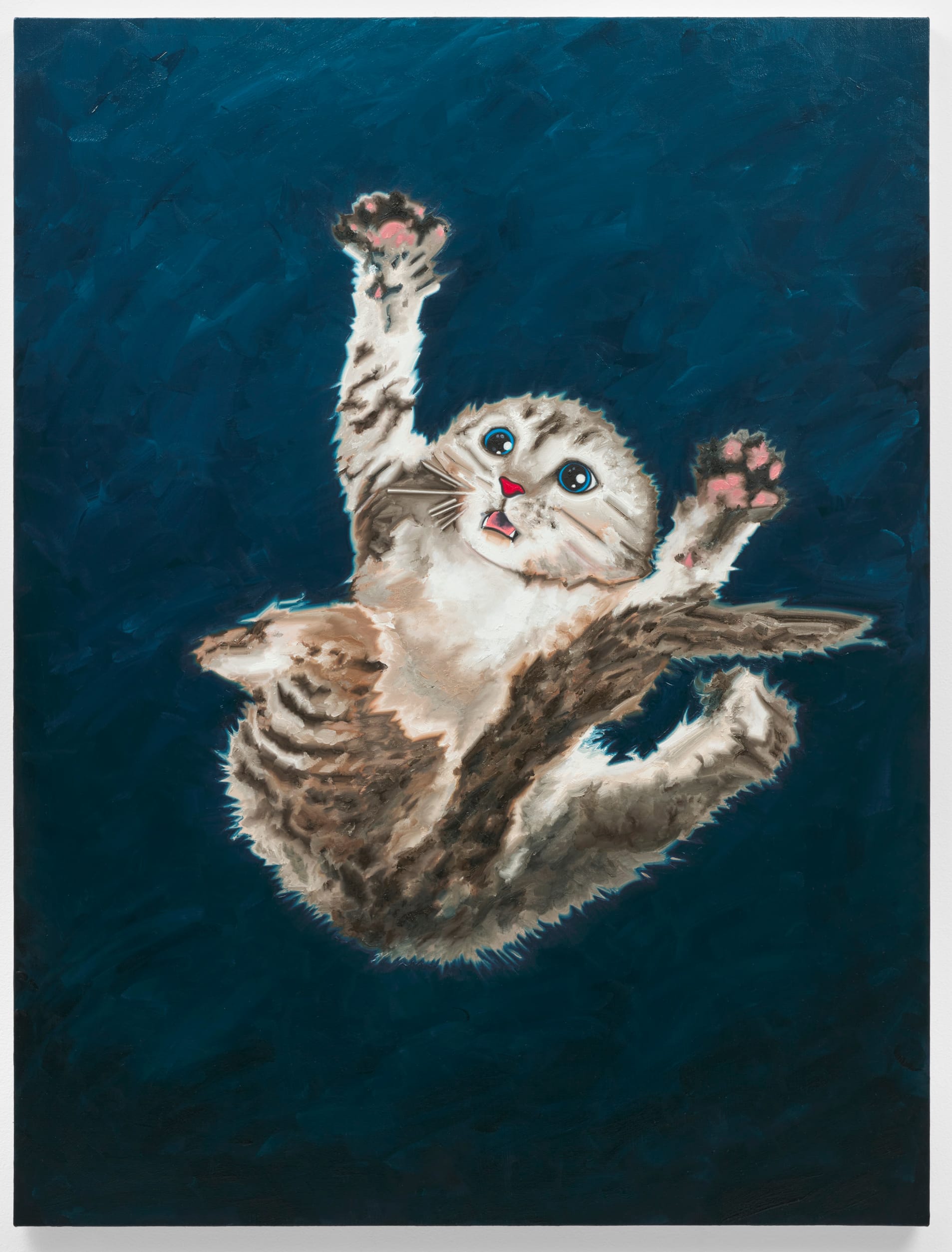 Other highlights include Katharine Kuharic's "Long Wait" (1990), an oil painting with such fine lines it looks like a tapestry, and Luke O'Halloran's "Eeeeeeeeeee" (2022), which shows a terrified cat approaching its terminal velocity (but rest assured, cats seem to defy the laws of physics surviving plunges from high-rise buildings). Elbert Joseph Perez's "Pierrot Greatest Performance" (2022) is a highly detailed portrayal of a cat presenting an ominous paw toward his toy likeness as an audience of creepy, obscured cats watches the animal from the dark.