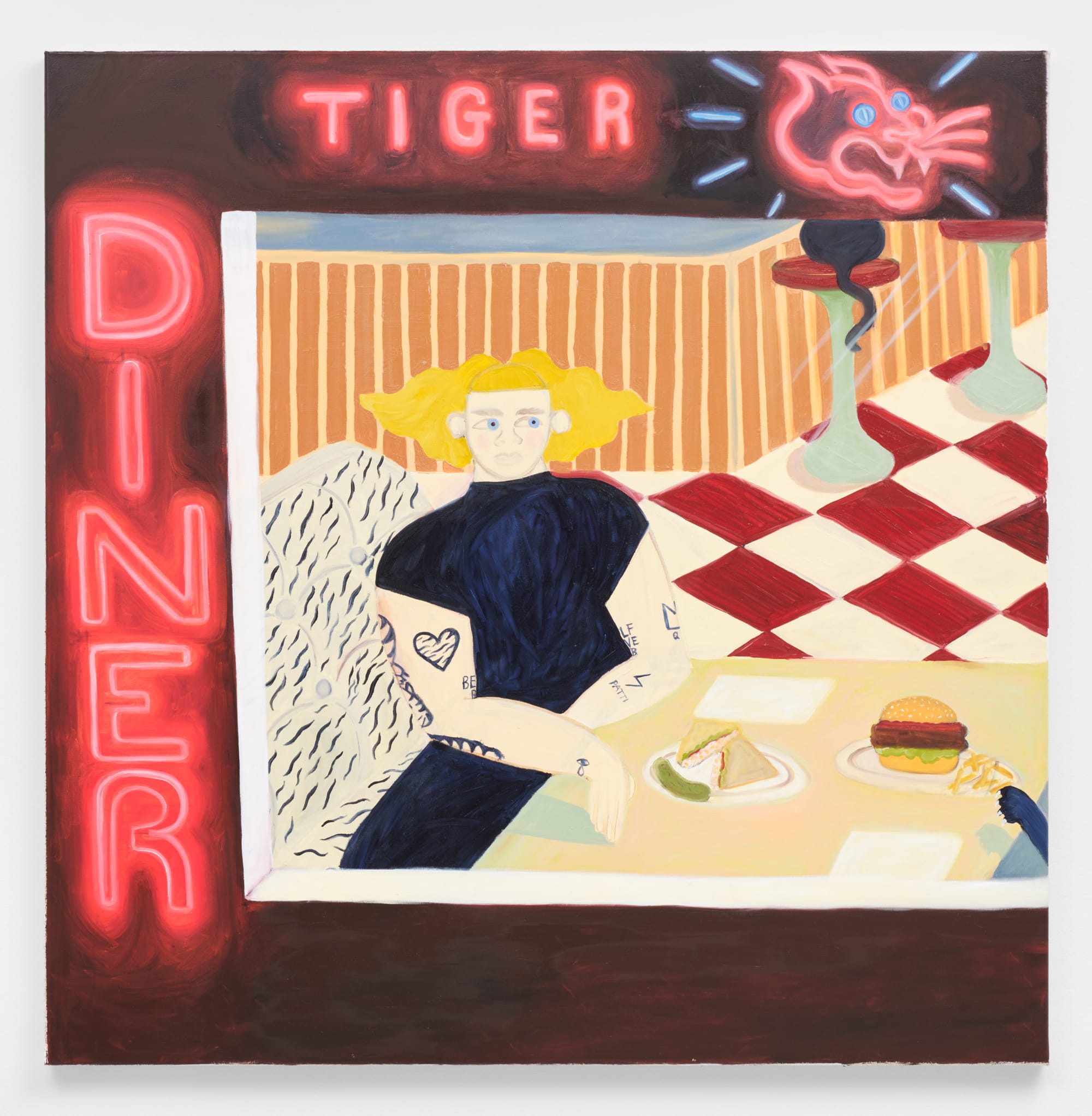 Other works in the show are decidedly more modern, such as Sophie Vallance's "Tiger Diner" (2022), which features the checkerboard pattern and rounded aesthetic that has become popularized on social media over the last few years. But like Druks, Vallance places cats in a surprising setting; namely, sitting in a diner.