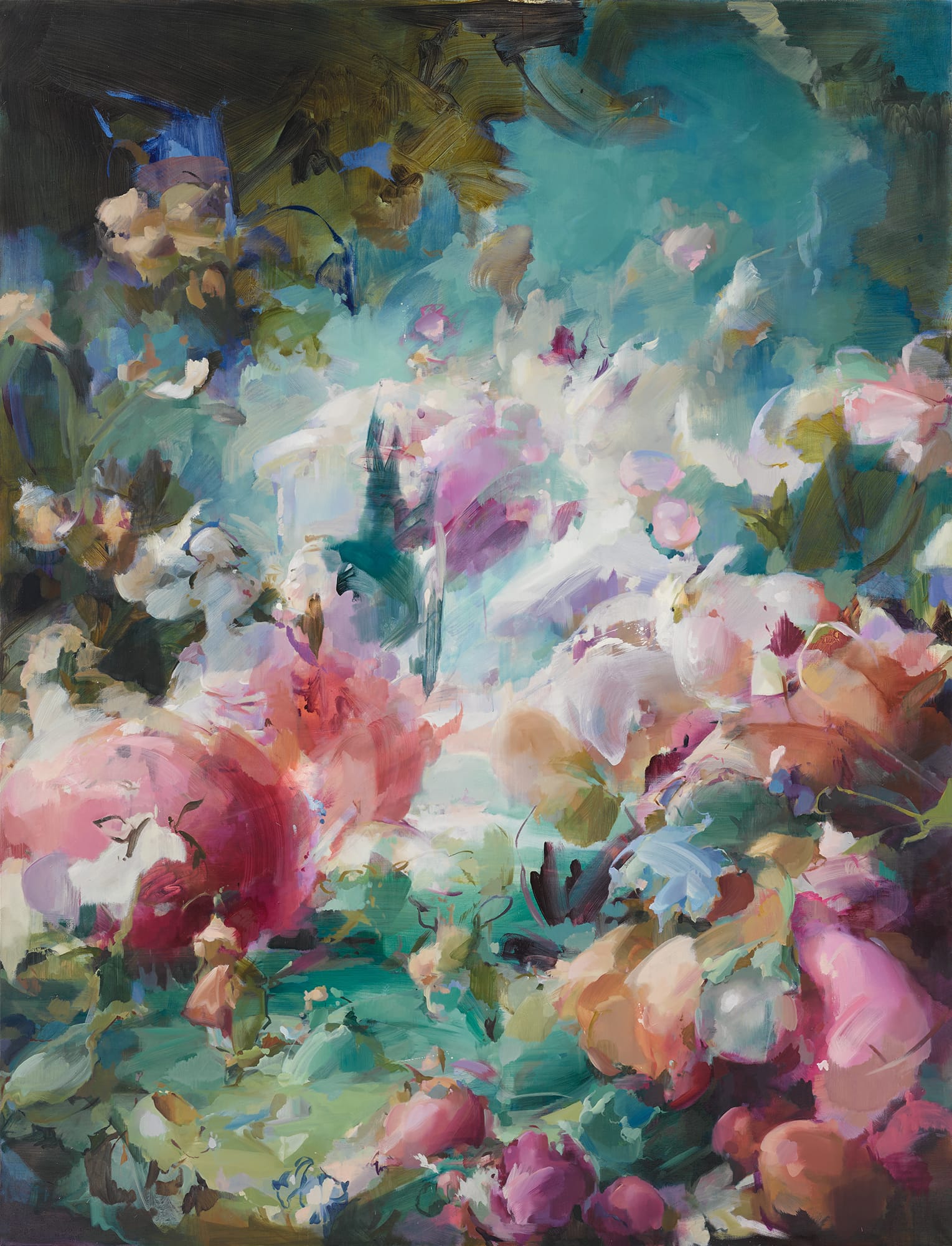 In the absence of distinguishable iconography, her Rococo language is surely, then, a “palette of porcelain colors” — except she declares an intention to “make these works quite contemporary … digitally based, to have a synthetic look” in a promotional video on the museum’s site. The core Rococo color spectrum has been expanded to include modern, zingy pigments quite alien in historical representational work.