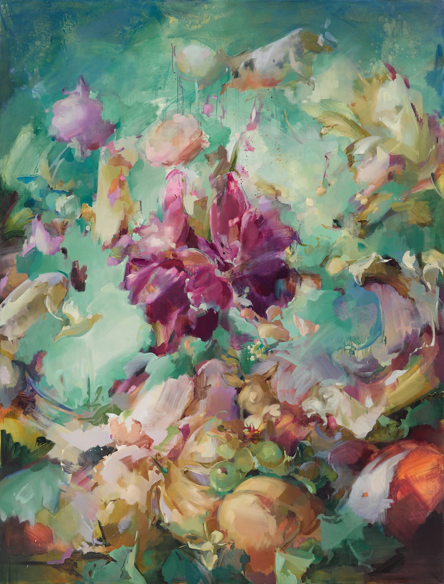 In terms of iconography, the fundamental ability to identify Yukhnovich’s as Rococo is hindered by its veering further into abstraction than legible representation; its legible referents, moreover, don’t adhere to the correct historical millennium, let alone the Rococo period. Her paintings are titled “A World of Pure Imagination” (both works 2024), clearly taken from the 1971 film Willy Wonka & the Chocolate Factory, and “Folies Bergère,” which obviously references Édouard Manet’s Impressionist masterpiece. Furthermore, captions describe these paintings as borrowing from the medieval artist Hieronymous Bosch’s “Garden of Earthly Delights” (c. 1490–1510), and the films Barbie (2023) and Fantasia (1940).