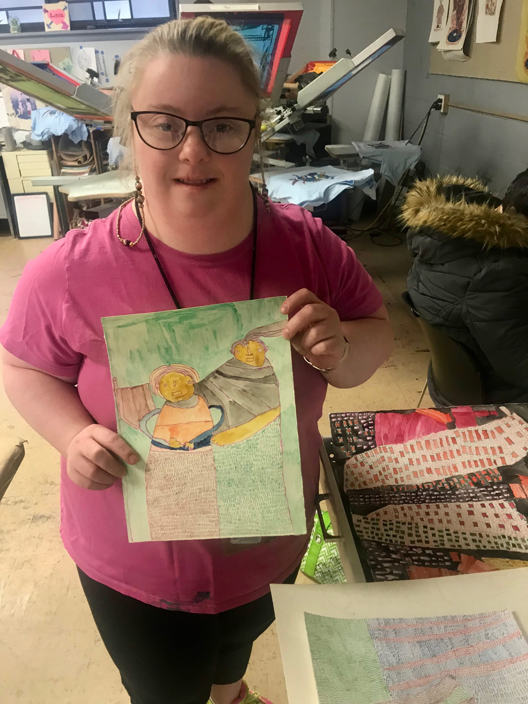 In the past and even today, people with developmental disabilities might be found making art in isolation at home, in hospitals, or other institutions. Sometimes their creation of artwork is encouraged, often it is not. For much of the 20th century, if their art was appreciated at all, it was by an art world which celebrated them as exceptional, and labeled them Outsider Artists. However, as this exhibition makes abundantly clear, artists with disabilities simply need access to facilities and materials to create their work, and the time to develop their styles. Some will thrive as artists, creating sought-after works. At the ArtYard opening alone, 33 pieces sold, ranging from hundreds to over a thousand dollars.