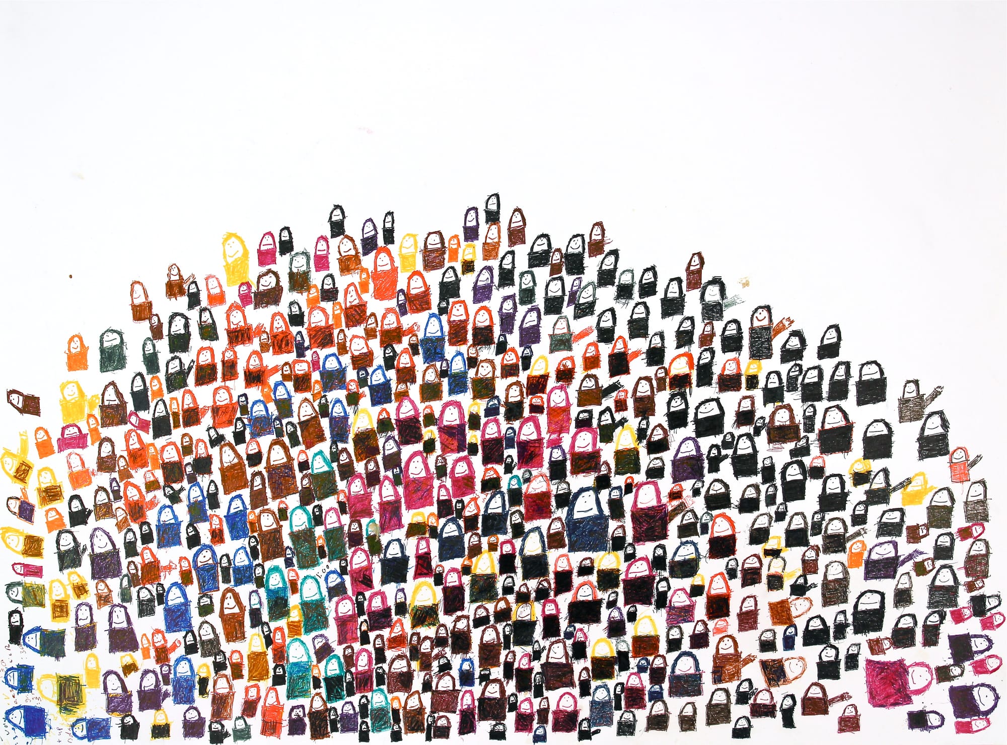The newest of the three studios represented in The Creative Commons is Philadelphia’s Center for Creative Works (CCW), which opened as a progressive art studio in 2010. The space had previously housed a “sheltered workshop,” where adults with disabilities did jobs such as stuffing envelopes and shredding paper. Artist Mary T. Bevlock, now 50, performed menial tasks for minimal pay for years. “It was almost like she was waiting forever for art to come to her,” says CCW’s director Lori Bartol. “And when we got here, she was just, ‘Bam!’ She dove in, she was completely dedicated to it. She loves being an artist, and so she found her style pretty quick.”