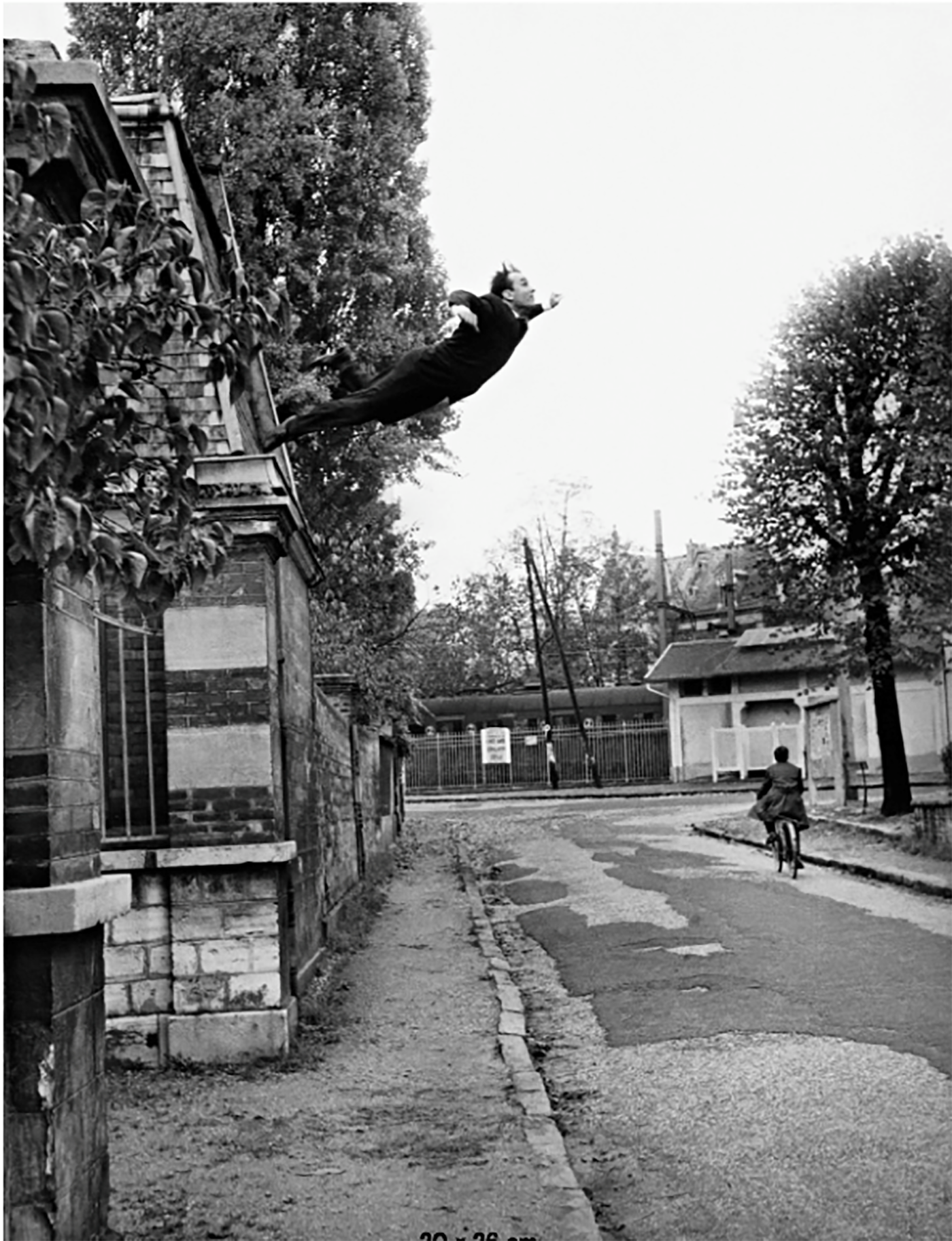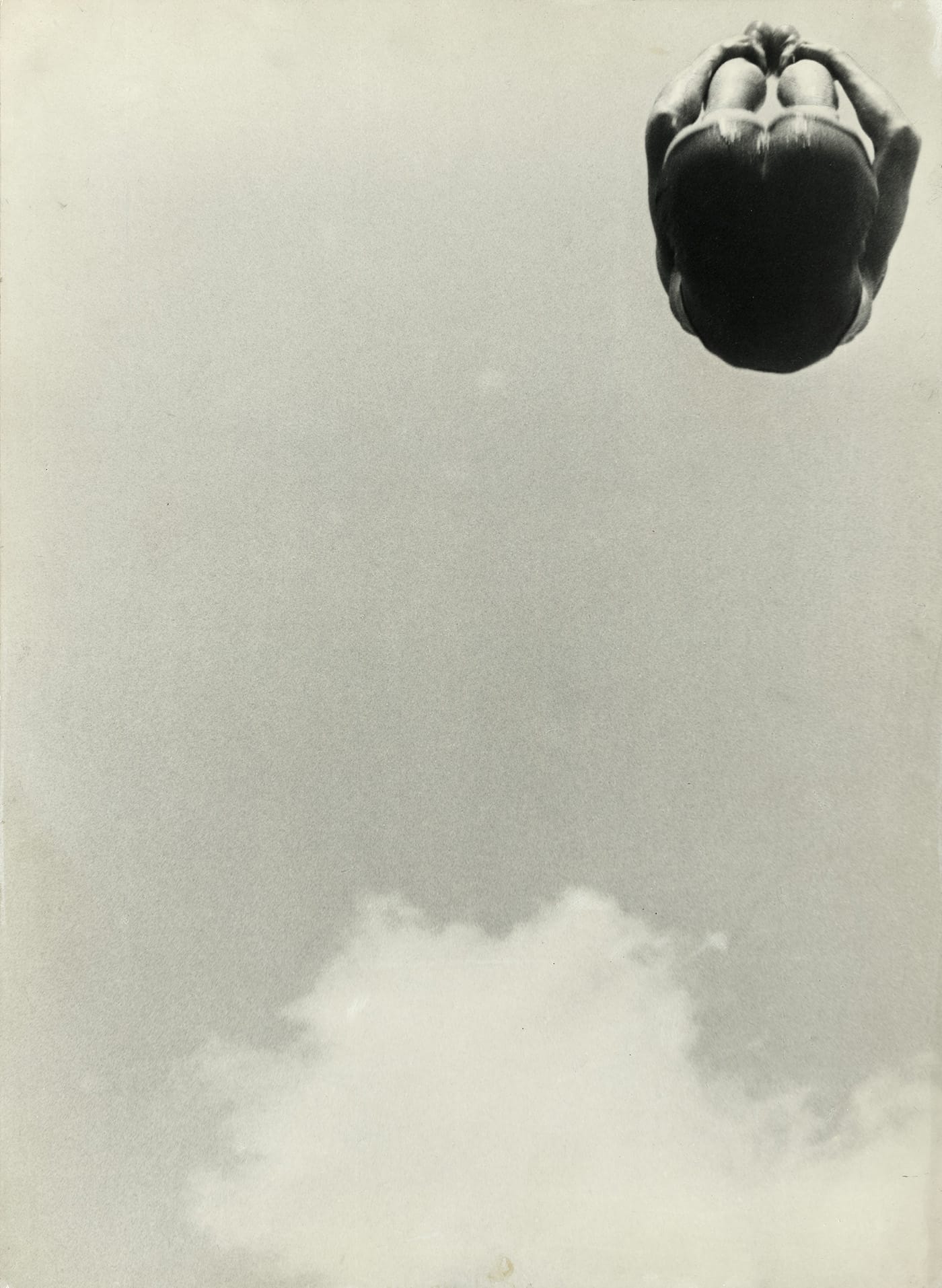 In Aleksander Mikhailovich “Rodtchenko’s ‘A Leap’” (1934), water meets skies in the aerial acrobatics of swimmers. The Soviet propaganda photographer (who also helped found Russian constructivism) captures the mid-air somersaulting body of a Russian swimmer during a dive from a high platform; above him only sky. In two unnervingly realistic photomontages — Lucien Pelen’s “Chaise n° 5” (2005) and Yves Klein’s “Leap into the Void” (1960) — the artists appear unalarmed by their impending crash. Pelen hovers mysteriously in the air while his hands balance a floating chair over an unforgivingly rugged rocky gorge in Southern France.
