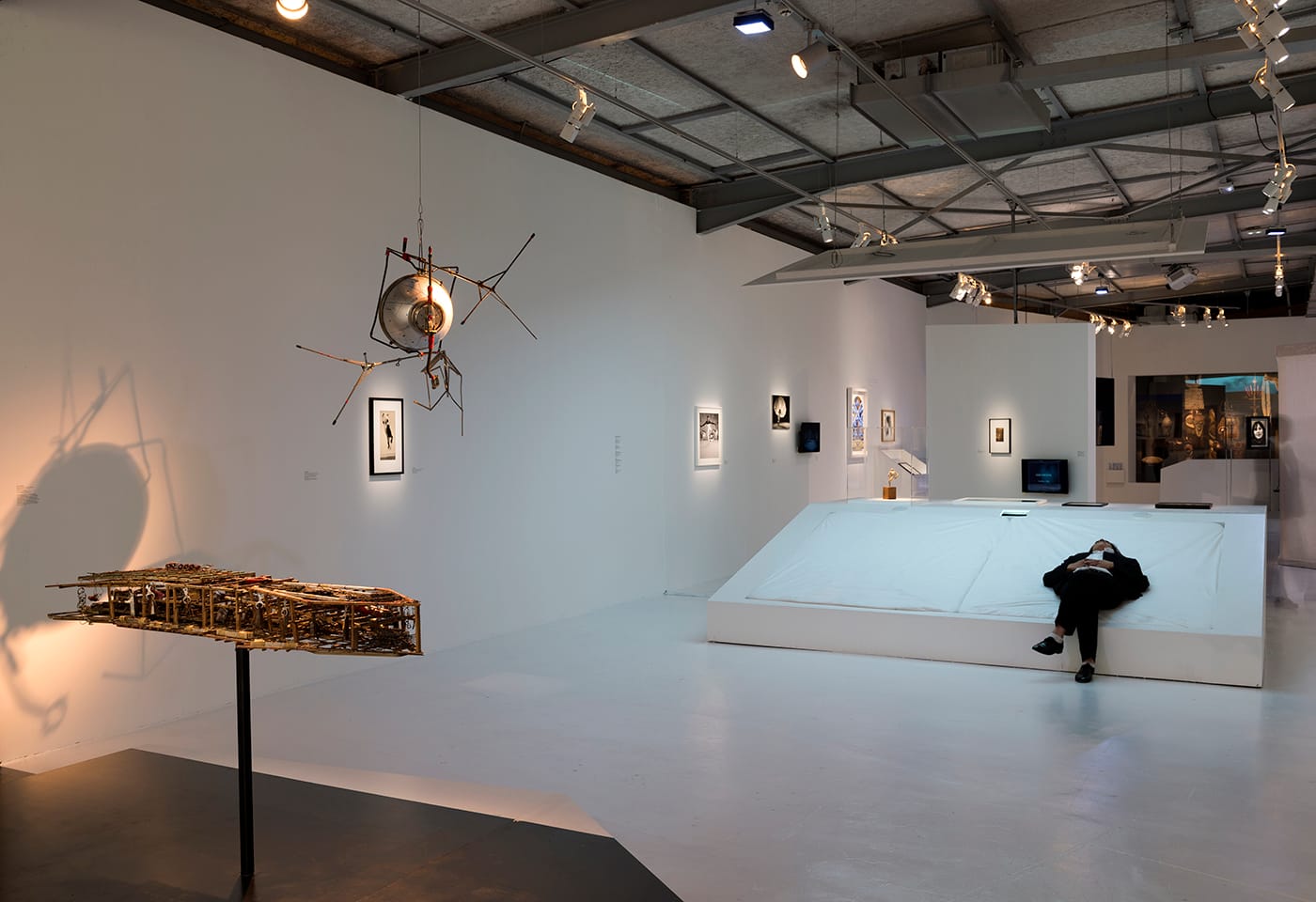 The show begins with a screening of a sequence from Federico Fellini’s La Dolce Vita (1960), which shows a statue of Christ transported by a helicopter being followed by a cheering mob on the ground. It includes an August Rodin marble wing sculpture — one of a series he made between 1896–1912 — juxtaposed with two of his sculptures of dancers, Nijinski (1840–1917), depicting the Russian ballet dancer and choreographer Vasilav Nijinski, who was known for his gravity-defying leaps. The dancer is seen gathering momentum on one leg before leaping into the air; or as Rainer Maria Rilke — Rodin’s friend and author of the 1917 monograph Auguste Rodin — put it, “Pressing down on this center, [he] would lift himself up and share himself out into movements.” Rilke and Rodin were great admirers of Nijinski, who agreed to pose for this work.