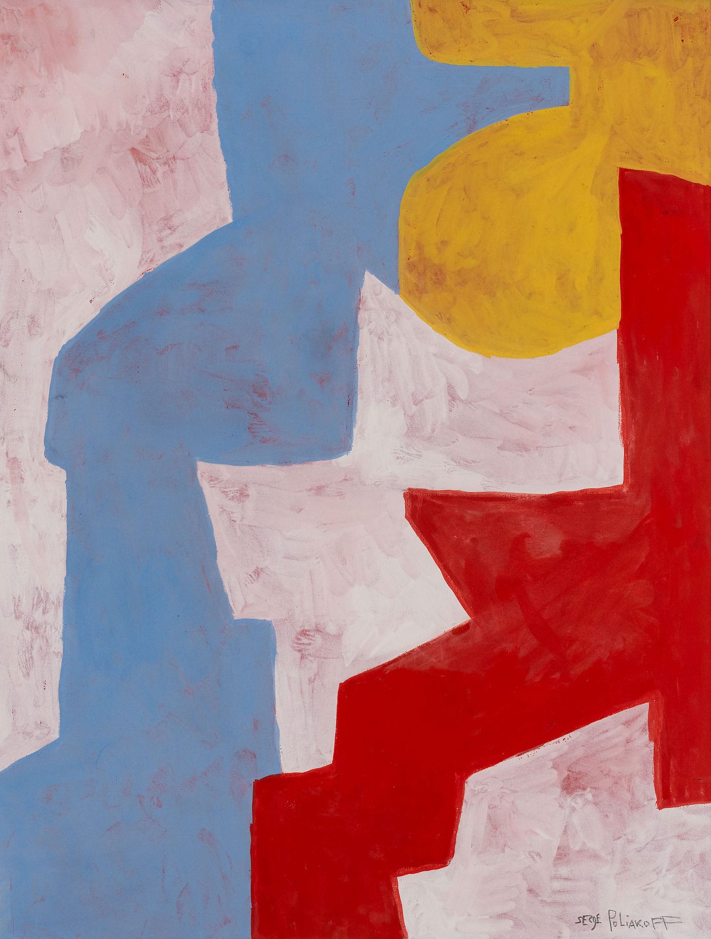 The Russian-born painter Serge Poliakoff (1900-1969) is a fascinating figure whose work deserves to be better known in the United States. When the Russian Revolution broke out, he was able to make his way to Bulgaria. In the early 1920s, he survived as a balalaika player touring Europe, eventually settling in Paris in 1924, where he performed in the city’s Russian cabarets for the next 30 years in order to paint. Starting in 1929, he studied painting at the Académie de la grande chaumière, Académie Colarossi, and Académie Frochot. One of his teachers was Othon Friesz, who had been a member of the Fauves before turning against Fauvism. While some critics have suggested that Friesz may have inspired Poliakoff’s interested in saturated color, it is worth remembering that they met after Friesz had started using a somber palette, following his experience fighting in World War I.