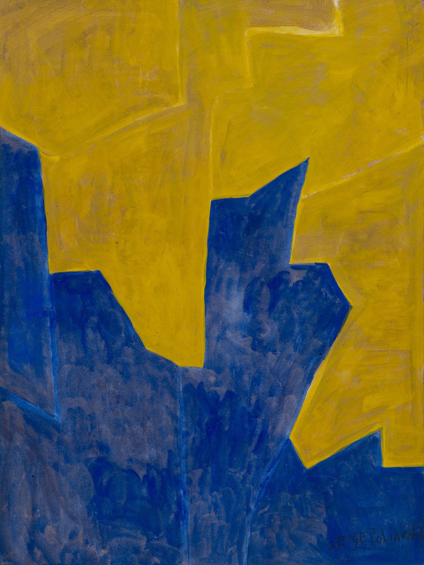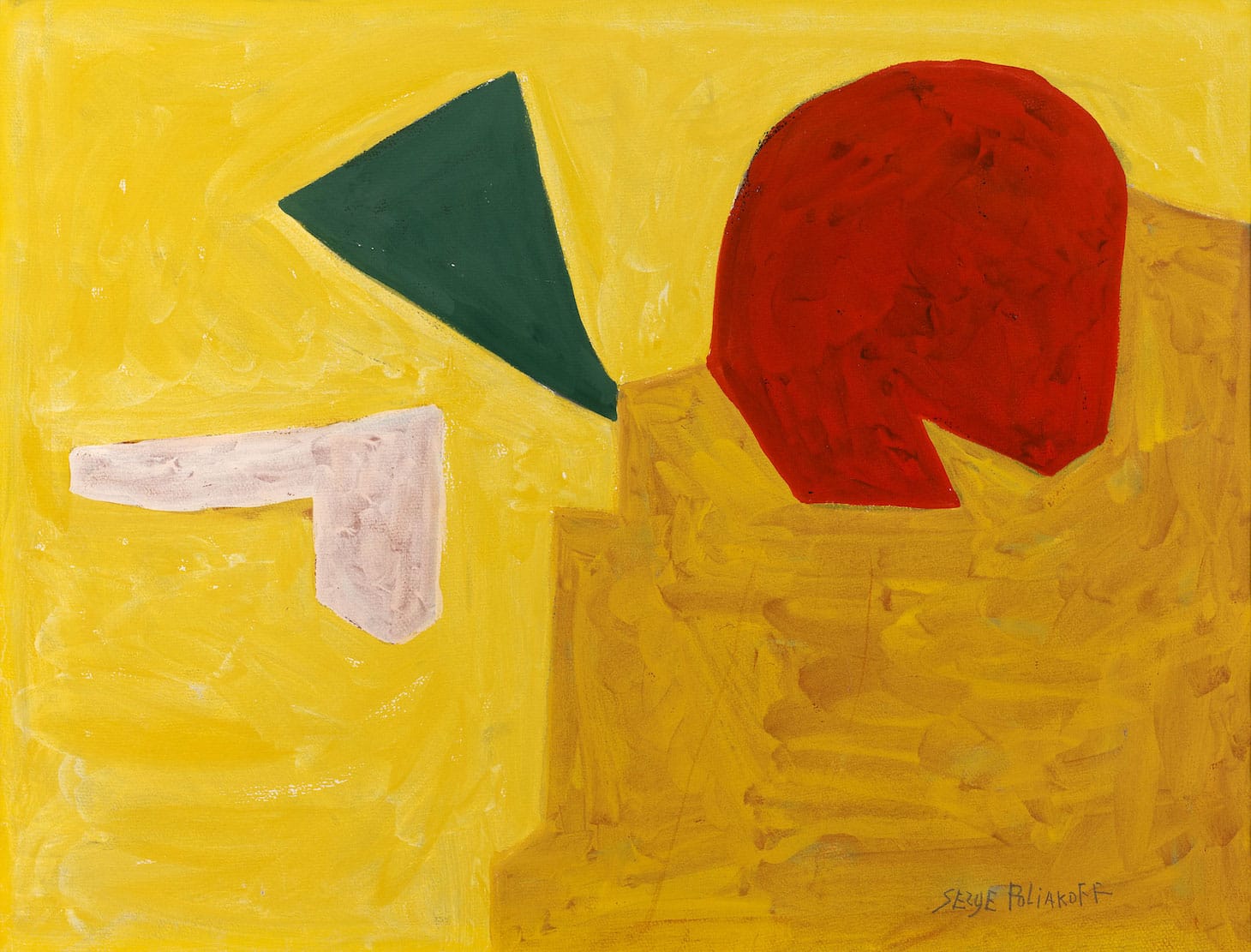 In “Composition Jaune” (c. 1955), Poliakoff centers a shape that is two thirds red and one third black and resembles a bowtie, surrounded by yellow. It is in the yellow that we can see what Poliakoff does that is unique. The yellow varies in hue to create distinct areas, including an arrow-like shape rising from the middle of the bottom edge and seemingly holding the bowtie aloft. Again, Poliakoff attains a visual tension between the figure and the ground, but in a different way than in the gouaches from 1938–40. With “Composition Jaune” our focus shifts back and forth, zeroing in on the seams between the red and black shape and the clearly divided yellow ground.