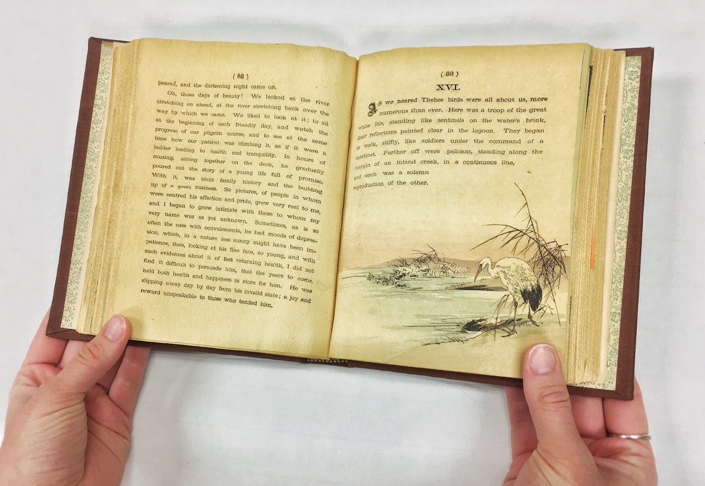 Like an “upside-down” map of the world where north and south switch places, the image of Egypt as conceived by Takejirō Hasegawa, an innovative publisher during Meiji era Japan, was located well outside the dominant paradigm and thus seemed startling to Western eyes. Their illustrations, collected in A Nile Voyage of Recovery, which was published in Japan in 1897, disrupt the familiar visual narrative of Ancient Egypt. Hasegawa specialized in books in European languages, often for Japan’s tourist trade and resident foreign community, which included many English missionaries. The text, by English missionary couple Charles and Susan Bowles, was standard-issue travelogue — it was the visuals that were a revelation to Western eyes.