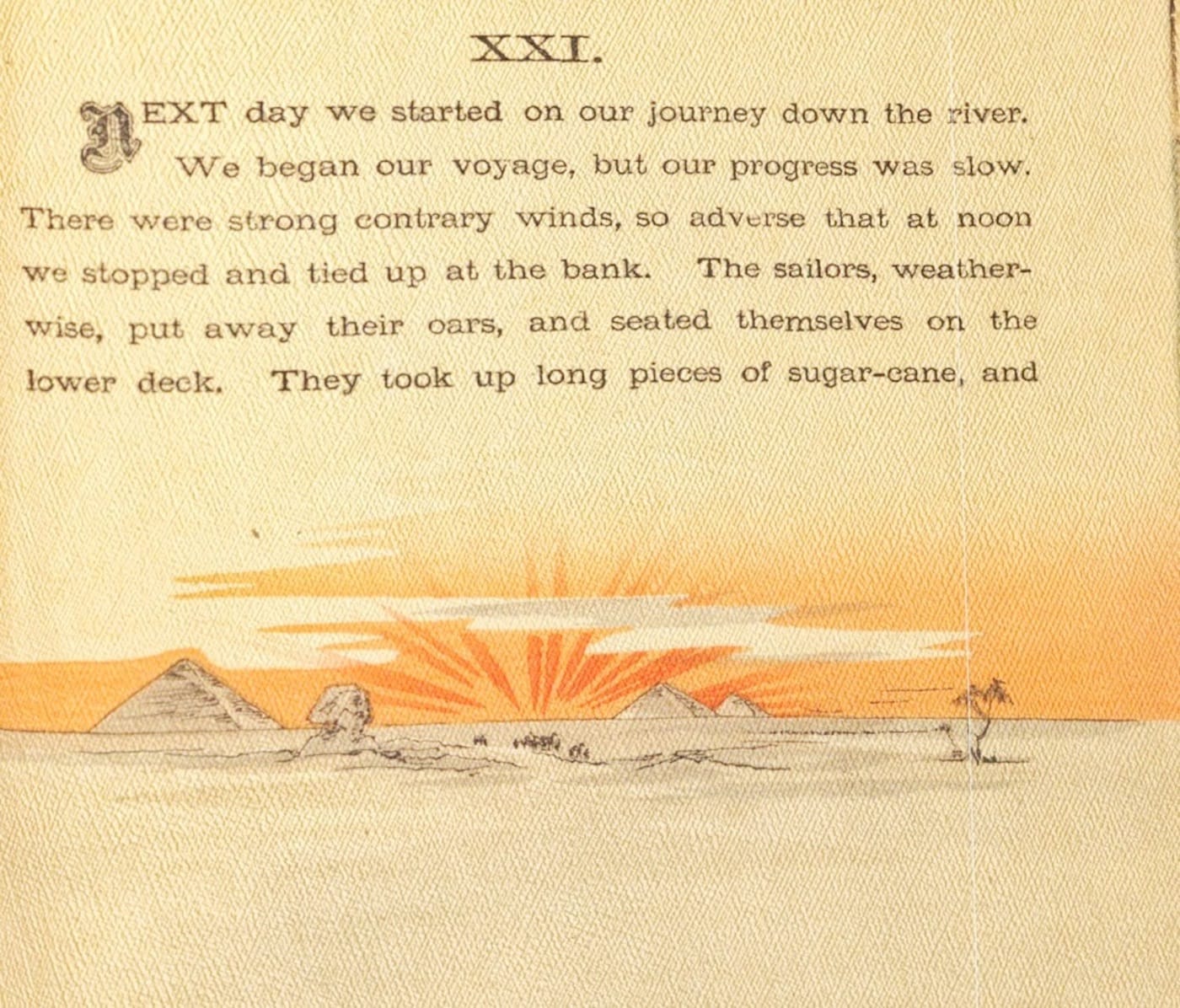 A Nile Voyage of Recovery is illustrated with graceful, colorful woodblock prints of Egyptian scenes and adorned with exquisite typography. The images are gentle and intimate, emphasizing detail and delicate color. Even pictures of the Sphinx and the great pyramids give more page room to rays of light and the sun than to the monuments. The Sphinx is an integral part of the landscape, but it does not dominate.