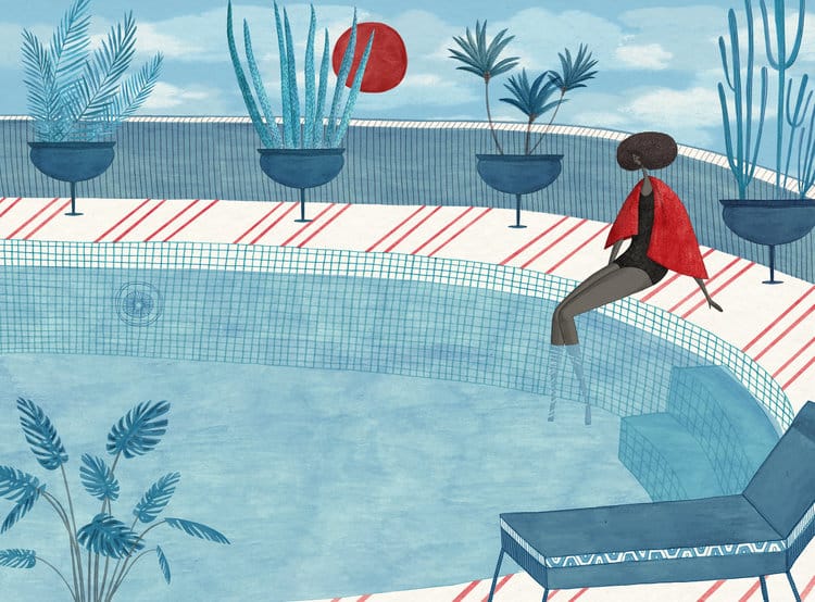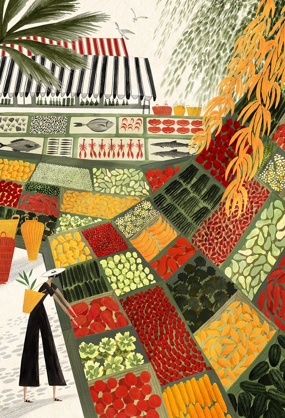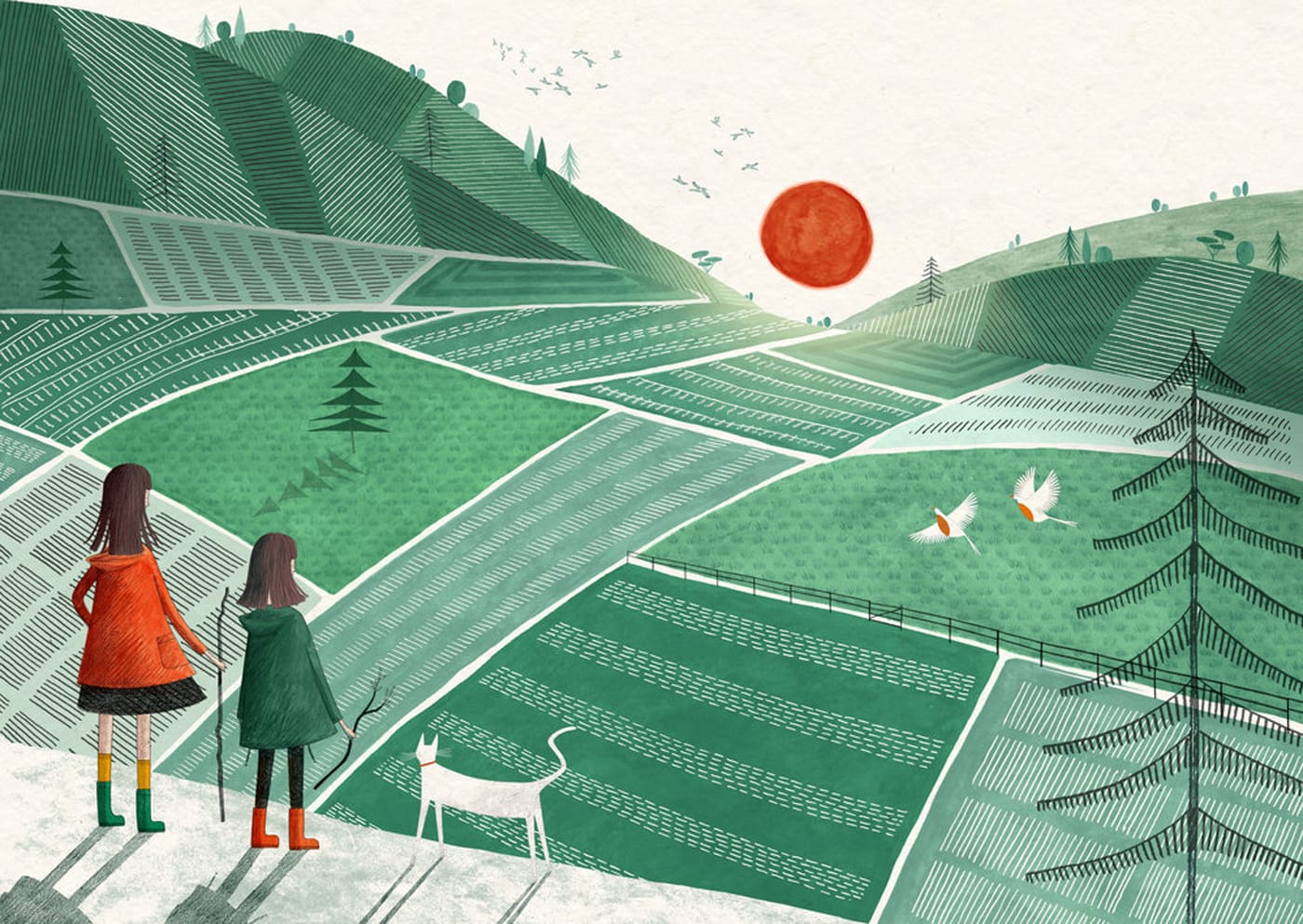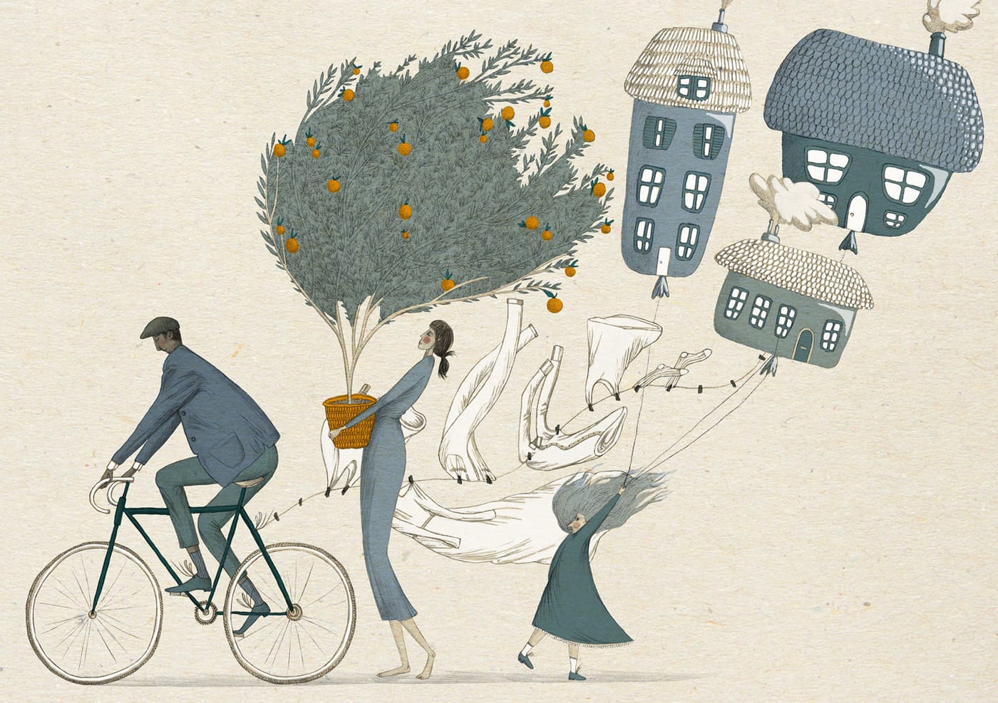 Tasker pursued her education in illustration at University of the West of England, Bristol, and has gone on to provide imagery for the New York Times, the Guardian, and Tangent Books, among others. Her perennial themes include near future quasi-utopias, gardening, and women at the work of daily living, and her characters play out their stories against landscapes that manage to be clean, but richly detailed. Tasker also leverages the power of color and tone to strike instant moodiness through a given tableau, adding weight to the overall whimsy and vibrancy of her style.