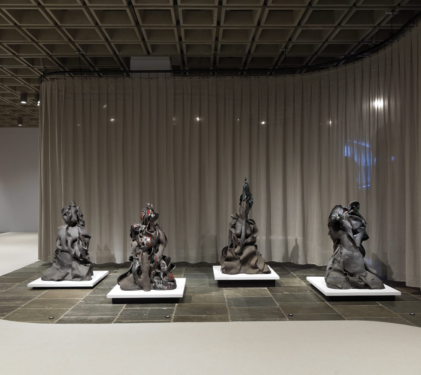 Organized by Shanay Jhaveri, the Assistant Curator of South Asian Art, and designed by Alejandro Stein, the exhibition is augmented by an unconventional display, which includes a pale grey stage curtain that snakes through the museum’s third-floor gallery, in front of which most of the sculptures are placed. The installation emphasizes an anti-formalist position, in which the works are placed democratically next to one another, and directly on the floor without a base.
