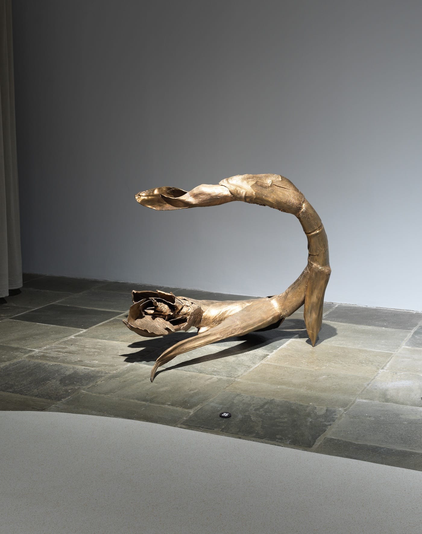 Two residencies at the European Ceramic Work Center, in 1996 and 2000, enabled Mukherjee to approach the grandiose ambitions of her fiber sculptures. She produced the large “Night Bloom” (1999-2000) figural ceramic works, four of which are in the current exhibition. These mysterious, cloaked idols construed of folds and flaps feel wildly improvisatory and classical at the same time. Afterward, the lack of technical facilities prevented the artist from further explorations with ceramics, and she turned her attention to bronze, her last hurrah.