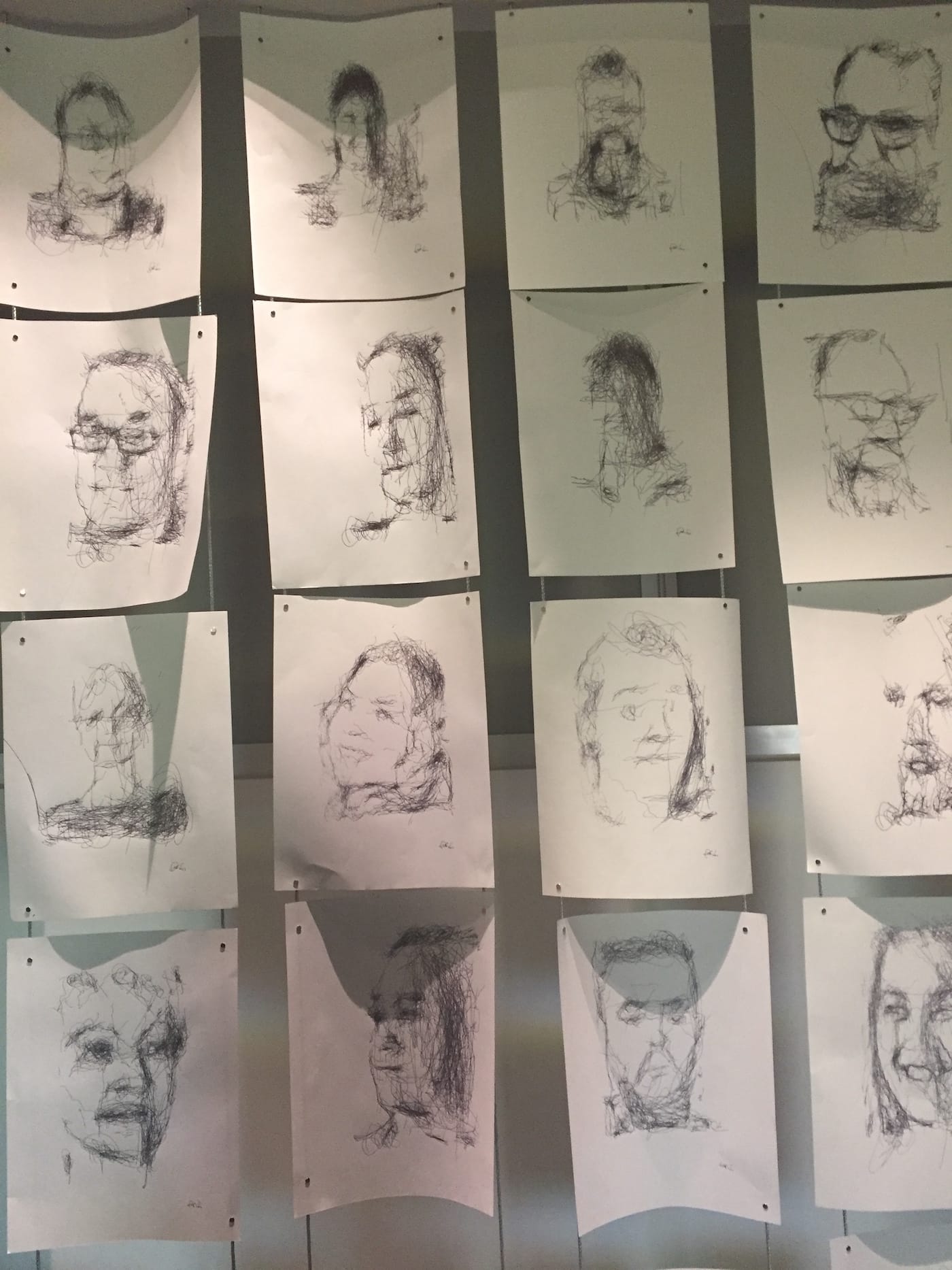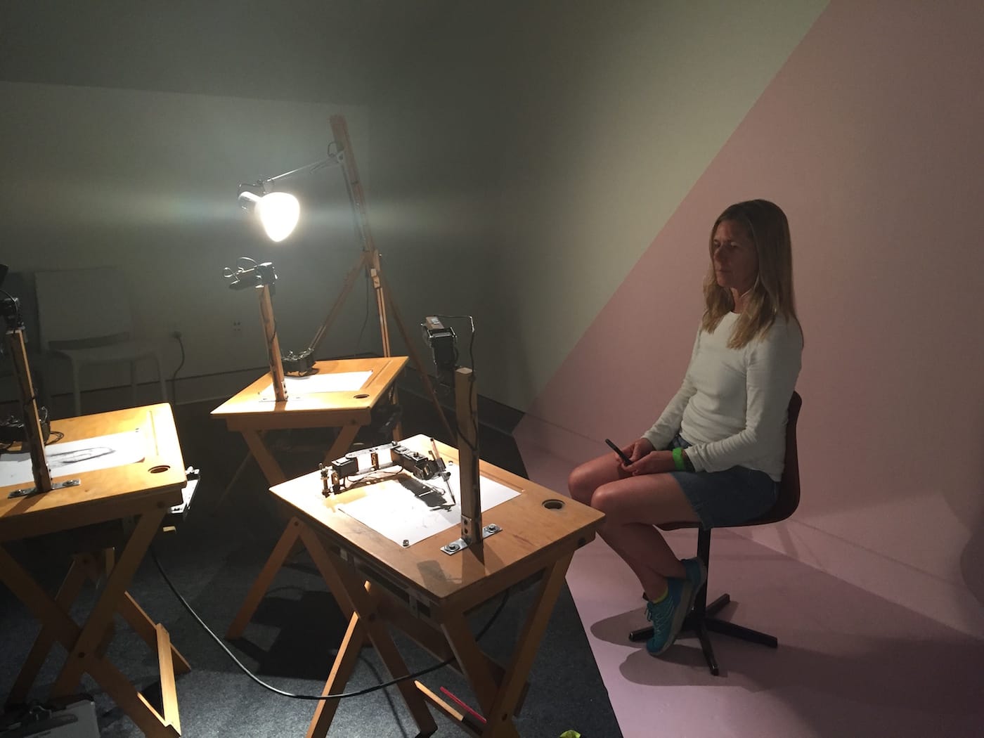In another vein, perhaps an impending singularity isn’t so freaky, if we all might harmoniously coexist with robots. My favorite piece was “3RNP,” designed by Patrick Tresset, where three robots named Paul draw a human model. The Pauls, which seem to be made entirely of gears and webcams, are seated at school desks; volunteer models inevitably look awkward as the robots’ arms — which look like protractors — piece together scratchy portraits. The finished drawings are hung on a wall nearby, in rows of abstract, pen-etched people. While there’s something unpolished and silly about this, its potential implications for the future make the process seem almost quaint. Strangely enough, if you look closely, the details of the portraits’ expressions are surprisingly detailed — almost human.