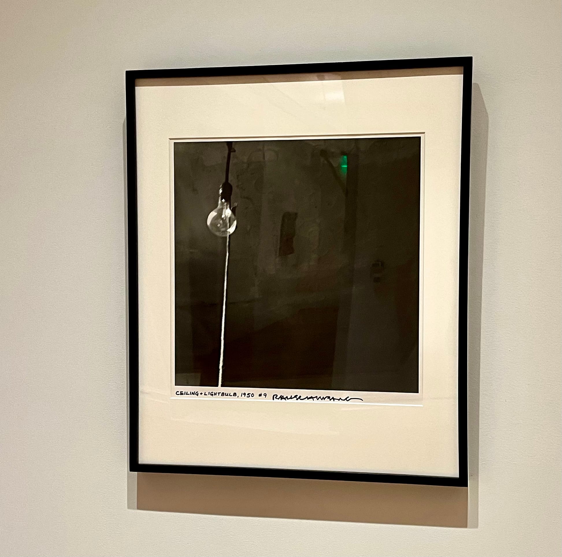 Also among the eight artworks are two of Rauschenberg’s earliest photographs, “Quiet House–Black Mountain” (1949) and “Ceiling + Light Bulb” (1950), both taken at the generative Black Mountain College in North Carolina. In the first of these works, sunbeams stream through a high window onto a wooden chair at such an angle that both the shadow and shafts of light appear to curve. Conversely, the bulb in the second remains unlit, leaving viewers in the dark about what might exist if only one could tug the switch. Taken together, the works picture the tangible effect of light and its absence on our capacity to interpret the world around us.