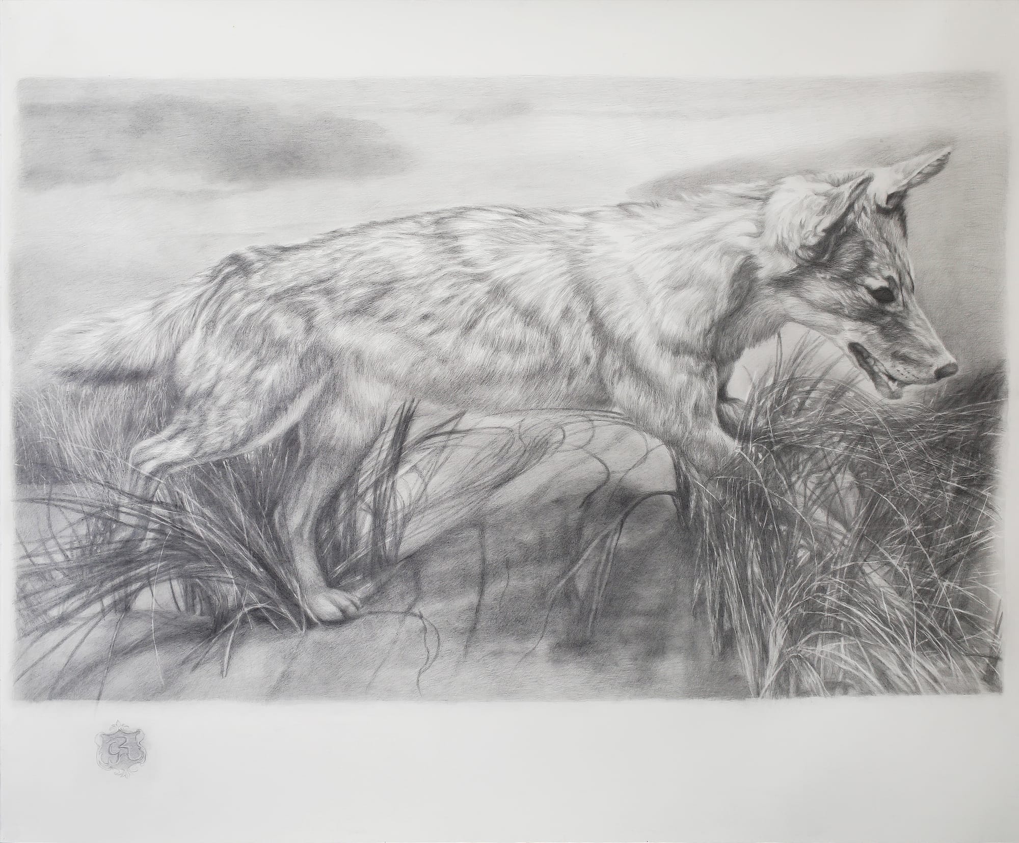 González’s lush, exquisitely executed drawings and paintings contain echoes of academicism and the Baroque. His careful attention to detail in works like “Coyote (The Creatures of Prometheus)” (2021) and “Gothchola” (2018) — where individual blades of grass and strands of hair are meticulously rendered — imbue González’s subjects with a life of their own, making them feel more real. In these and other works, the artist depicts humans and animal border crossers who move freely between places and cultures. In “Mariposas en el muro (Butterflies on the Wall)” (2021), a woman standing beside the border wall’s steel bars is surrounded by butterflies. These are among the countless species negatively impacted by the construction and expansion of the wall, but, in a hopeful gesture, González shows the butterflies flying freely between both sides.