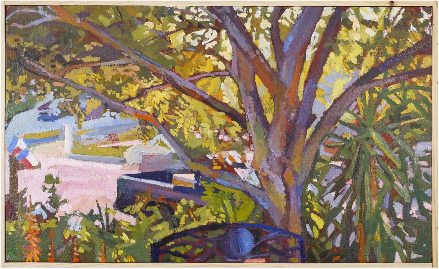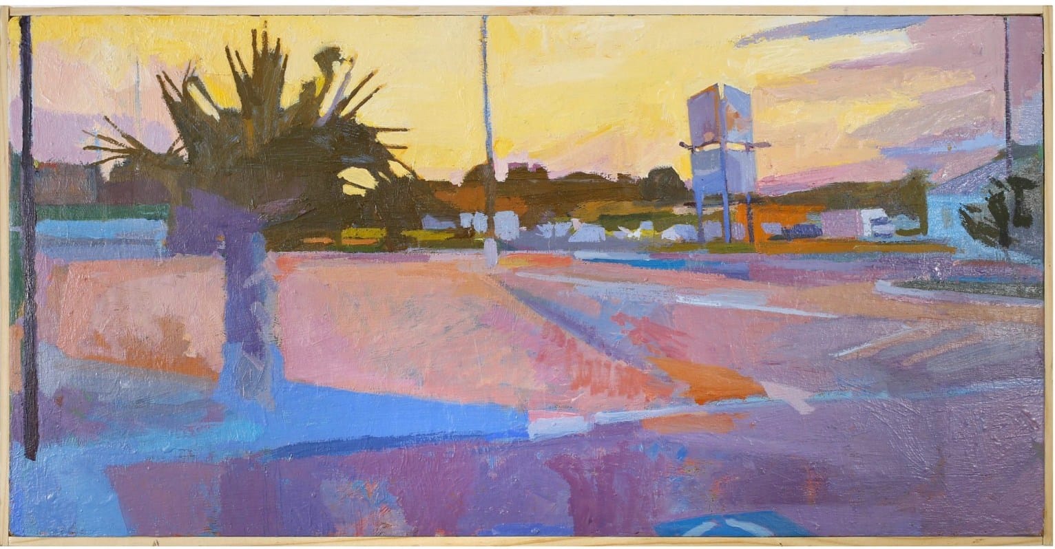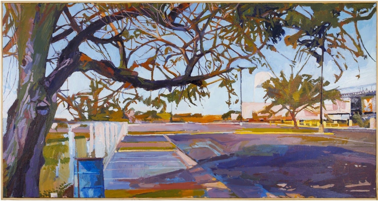 Lyles brings the Western art historical tradition of plein air painting to South Texas. His works capture an Impressionistic sense of light and shadow across the area’s vacant shopping centers and sleepy neighborhood streets, but with expressive marks and pungent colors. “Stadium Parking #1” (2018) represents the artist’s interest in the places where nature and architecture meet. In it, a gnarled mesquite tree stretches over an empty parking lot, pushing the tidy faraway stadium and water tower to the margins of the picture. Like the region itself, Lyles’s work is pervaded by a sense of quiet, still heat.