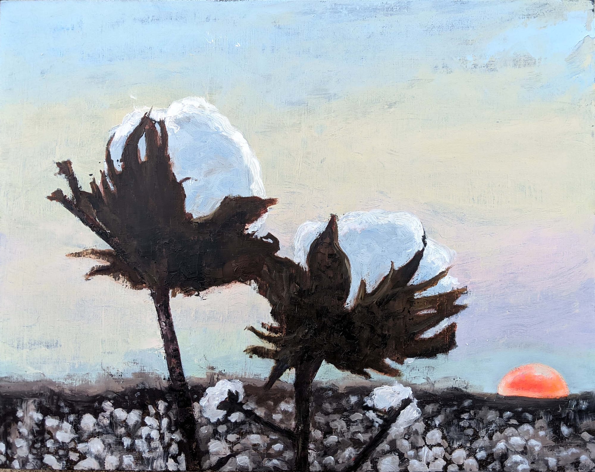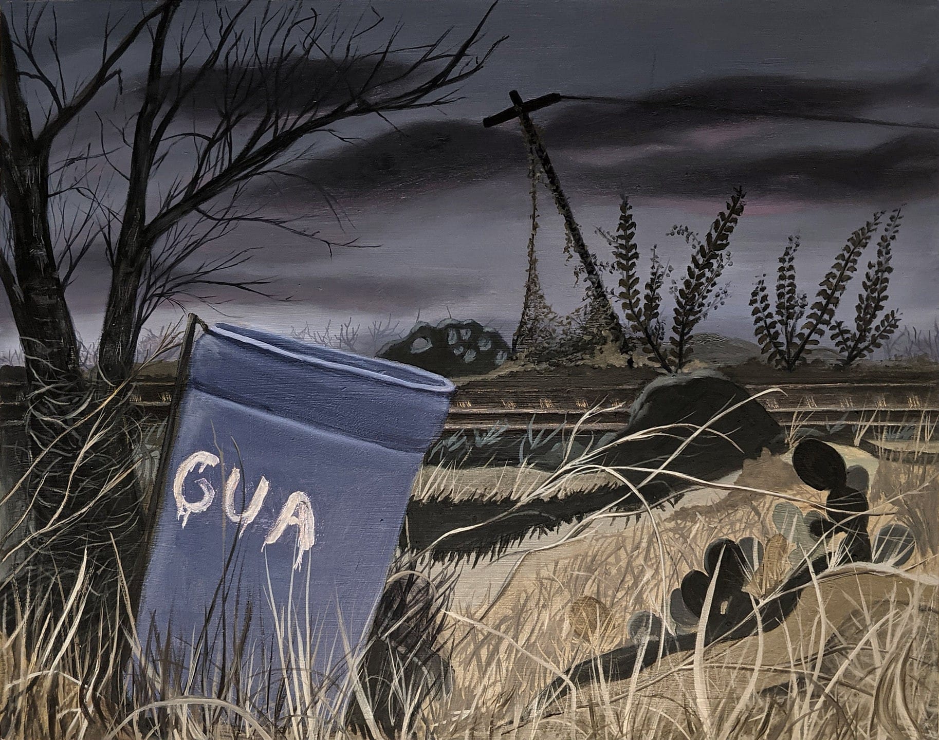 Palacios’s paintings examine her deep ties to the land, and the ways that it’s used by others. In “Sunrise” (2021), two cotton pods stretch over a crowded field as a red sun emerges on the horizon. Sketched in agitated brushstrokes, the plant’s prickly calyxes signal the dark legacy of cotton, sharecropping, and exploitative labor in South Texas. “I absorbed my parents’ stories about migrant farm work, cotton picking, and the discrimination they experienced,” Palacios said. In other paintings, she shows floods left by the energy industry’s overzealous fracking, and desolate grasslands where blue plastic barrels hold water for crossing immigrants and refugees. Even when people aren’t visible in Palacios’s work, their presence and suffering is evoked.