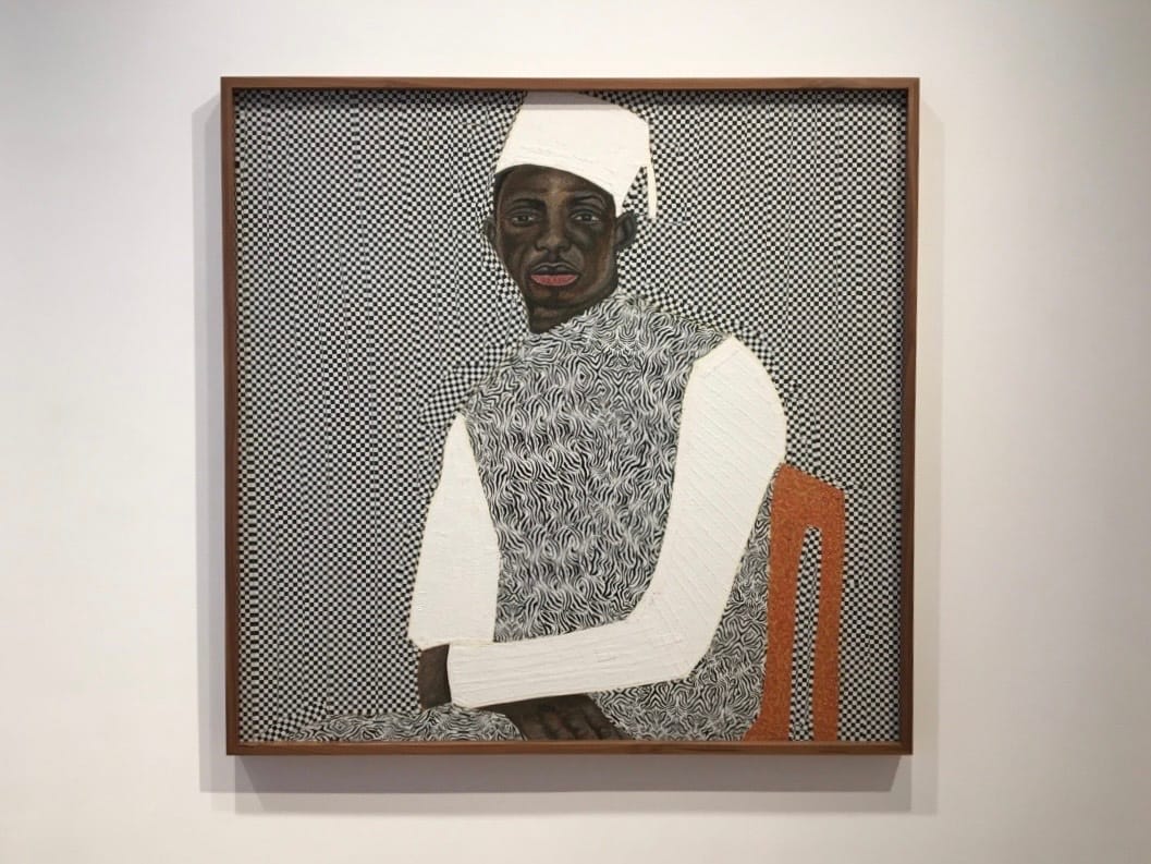 This too is a running theme throughout the works displayed in Clottey’s first show at Simon Lee: the singular and the collective. The singular within the collective. Stepping back from the mosaics you see a blur of orange and yellow. Up close each square has its own character, revealing secrets about its past life. The subjects of the portraits are taped-up in the same patterns, but their sense of style is utterly original. Clottey’s work here — particularly his use of pattern — emphasizes a sense of interconnectedness and the world as a global village, presenting a kind of homogeneity that doesn’t entirely blot out individuality.