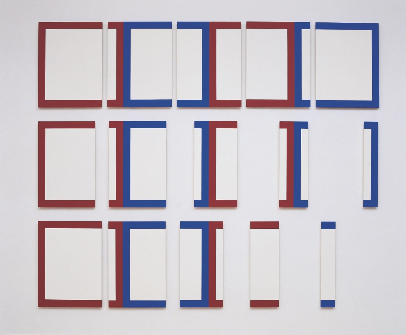 The familiar artistic idioms range from large-scale, colorful, geometric abstract paintings to happenings like Tamás Szentjóby’s, “Sit Out/Be Forbidden” [1972], conceptual work such as Dóra Maurer’s, “Proportions,” 1976), and body art projects that include Tibor Hajas’s, “Extinction,” (1979) by artists whose names are anything but familiar within the New York scene. Ilona Keserü Ilona’s stitched linen tapestry evokes the textiles of the Pattern and Decoration movement, Imre Bak’s boldly colored, abstract canvases bring to mind hard-edge painting, and Maurer’s painted wood panels are reminiscent of the work of Jo Baer and Lygia Pape. Readily available connections are also present in some of the exhibition’s performance-based pieces — the black and white studio photographs of Katalin Ladik’s and Tibor Hajas’s naked and often distorted bodies share obvious affinities with the work of Hannah Wilke, Vito Acconci, Ana Mendieta, or the Viennese Actionists.