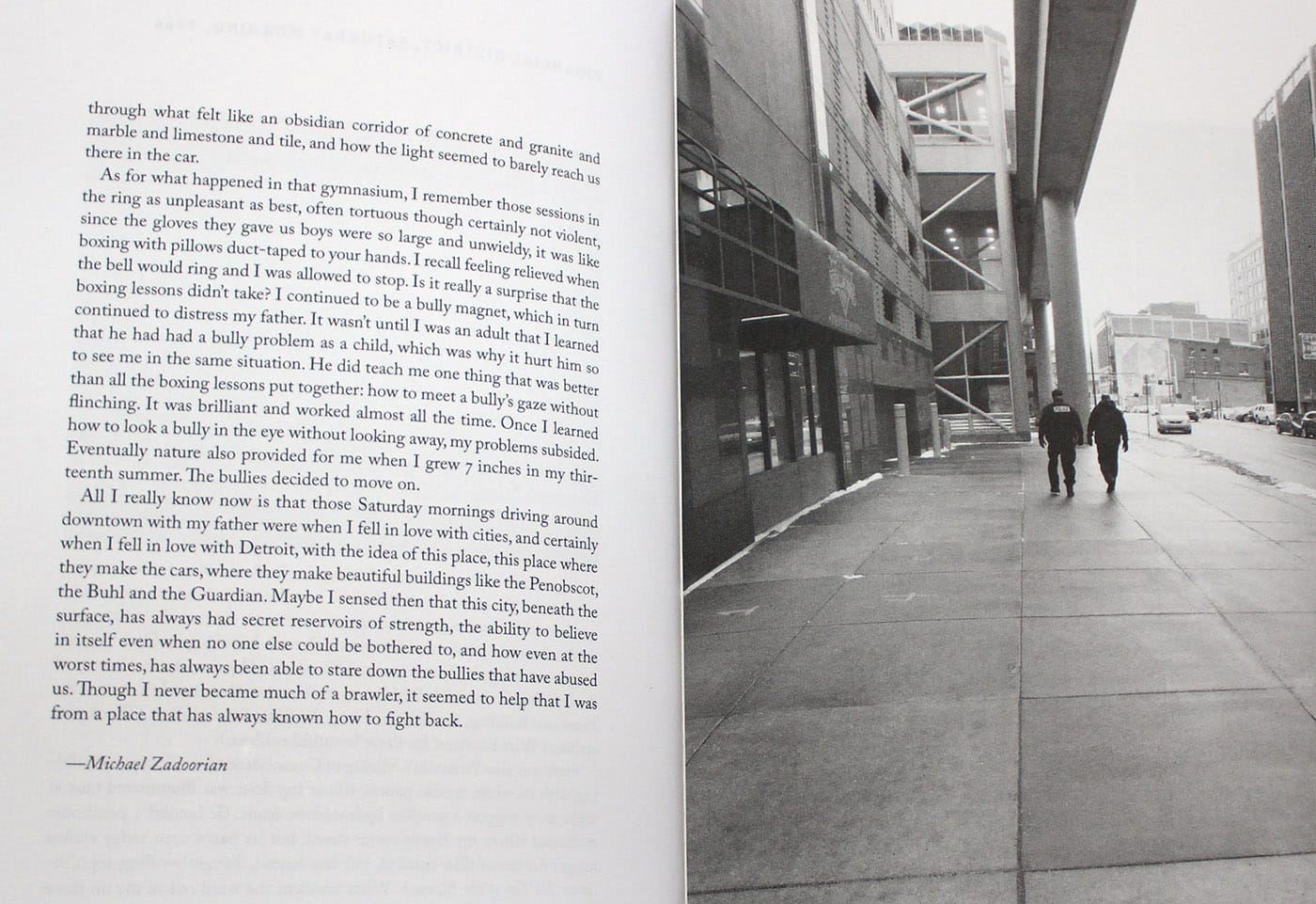 “My favorite stop is Cadillac Square,” said Tobier, “for the social/architectural mix of the City County Building and the small back streets, parking lots, and places I have gotten to hang out.” In addition to his opening essay, annotations, and epilogue for the book, Tobier contributes a series of photographs depicting Detroit environs adjacent to the People Mover — sold a little short by the black-and-white printing of the publication by the University of Michigan Library. Tobier also served as editor for the 15 artists and writers, whose contributions reflect a jumble of conflicting emotions, hard data, and layers of memory. After all, the People Mover has been circling around Detroit’s psyche for going on 30 years.