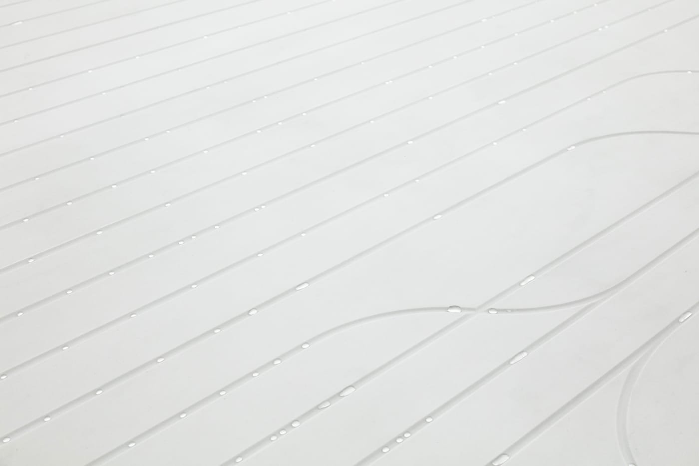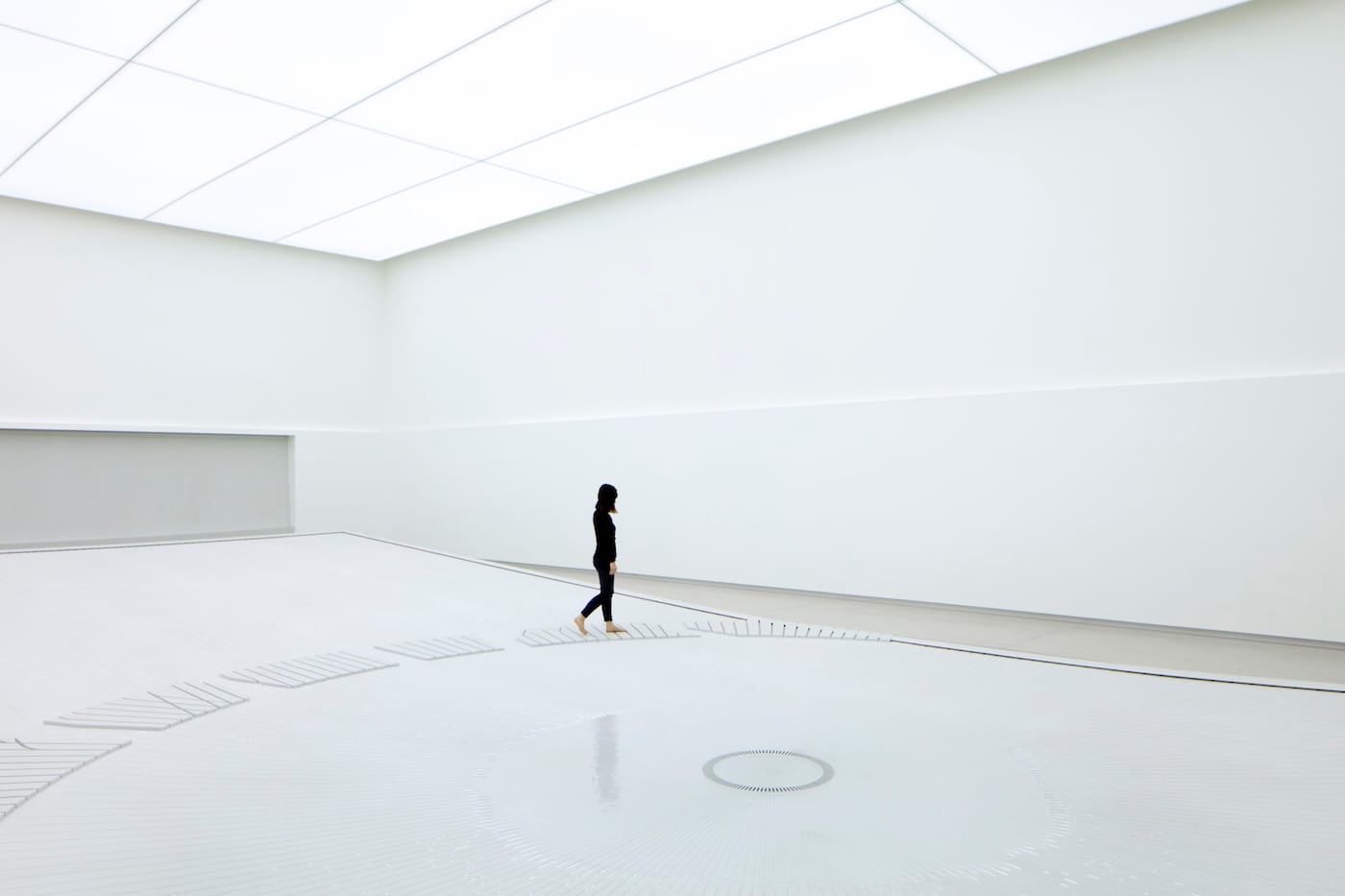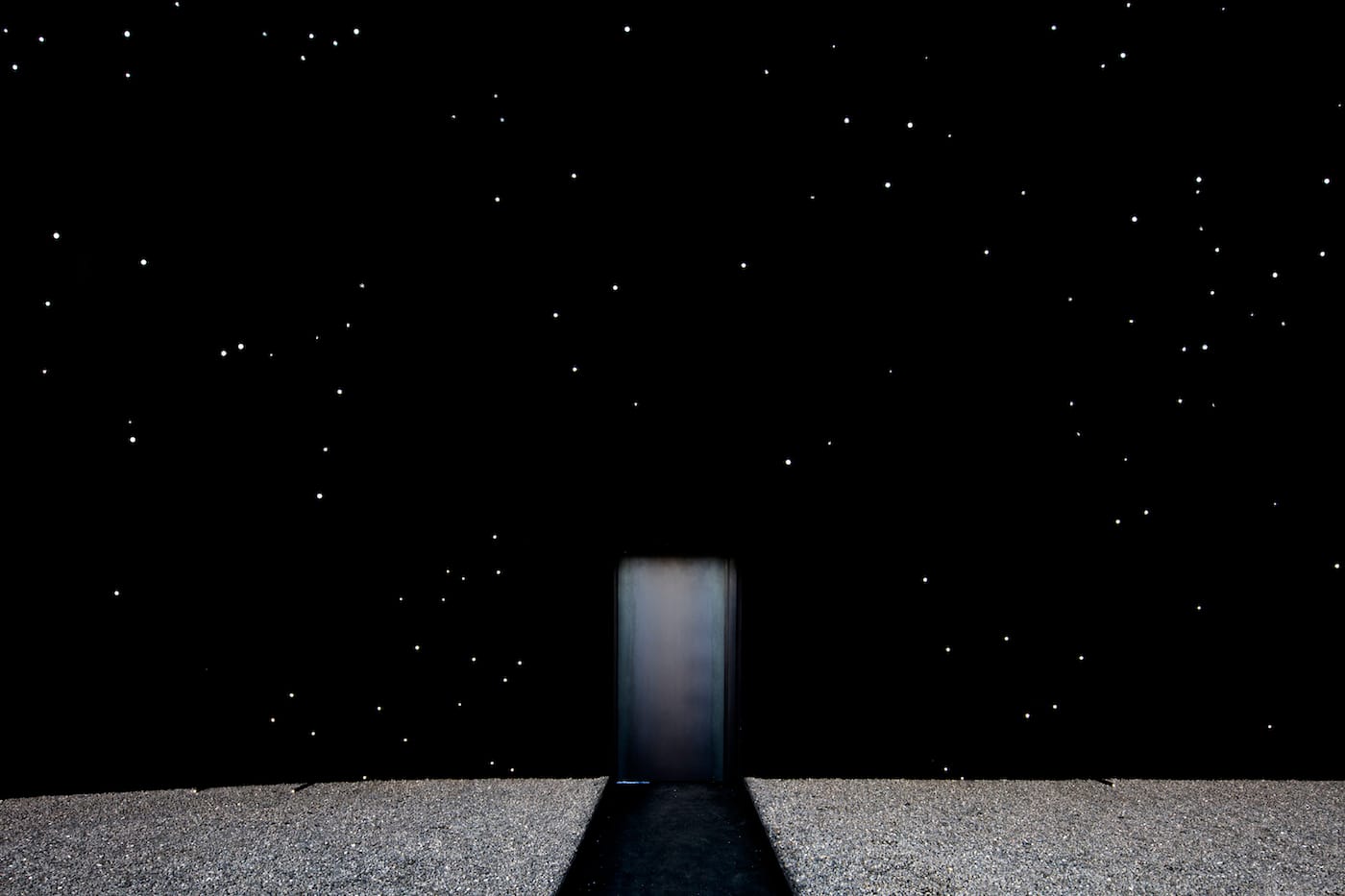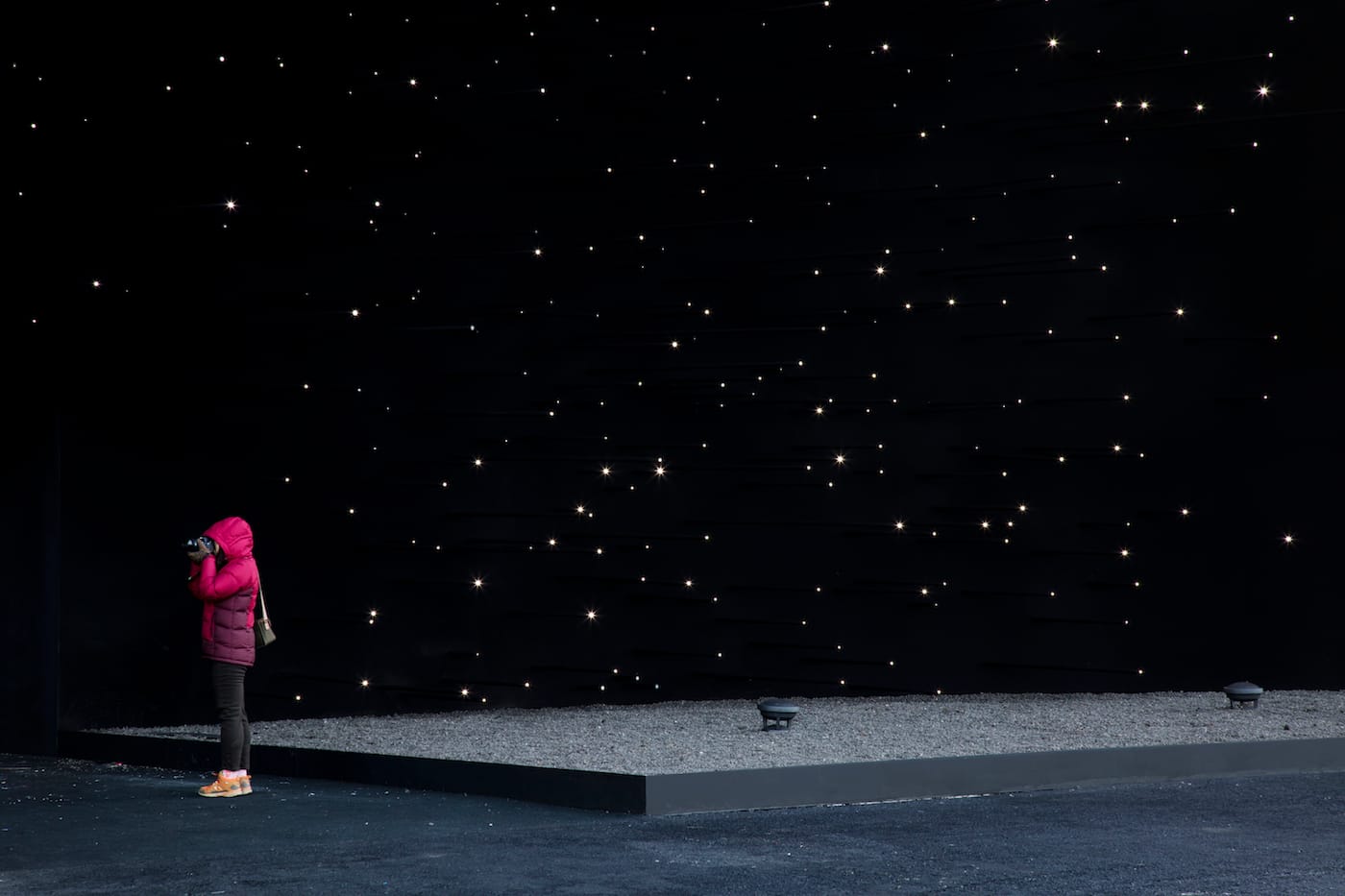 The building’s exterior is illuminated by thousands of lights, to give the “appearance of a window looking into the depths of outer space,” Khan told Hyperallergic. Its inside is actually exceedingly bright, sheltering a multi-sensory water installation, where water drops move through tiny straits carved into an expansive plane. Outfitted with haptic sensors, the installation responds to visitors’ interactions.
