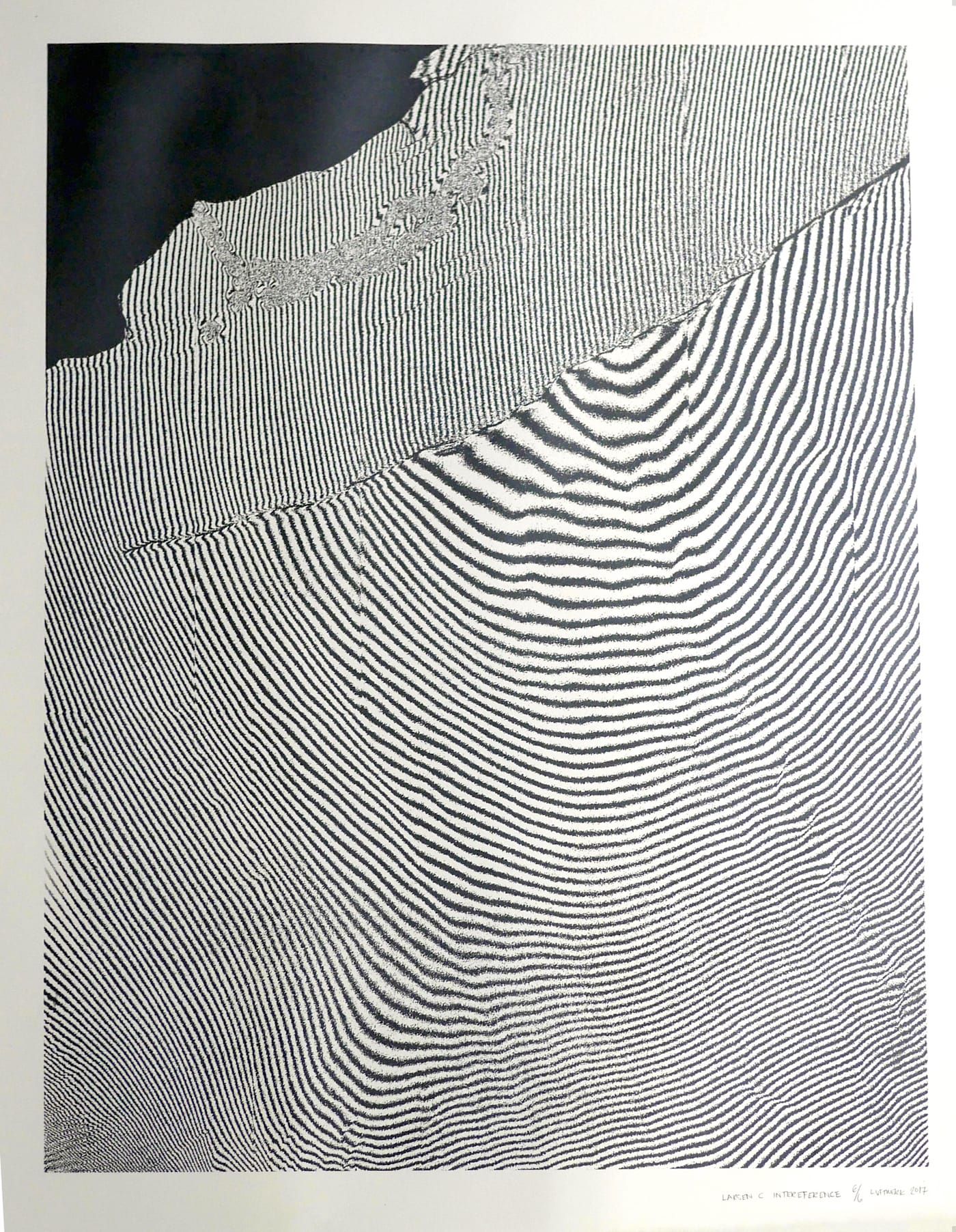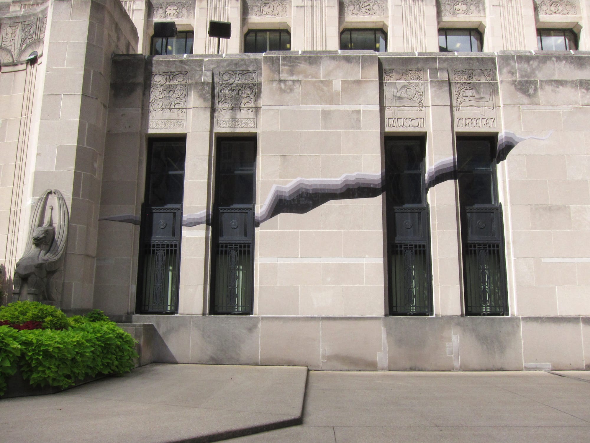 The sound flows from four speakers that perch on the first-floor ledge of the art deco skyscraper; aside from these and some informational signage, only a discrete vinyl application on the building’s facade lets you know this is an artwork, rather than an alien din that suggests an ominous disturbance to the city’s rhythm. The black-and-white vinyl piece extends 70 feet along the wall, designed as a 1:900 scale representation of the Larsen C’s crack. Luftwerk also created prints of a pattern inspired by the crack as well as a vinyl record, which were given to supporters of the project’s Kickstarter campaign.
