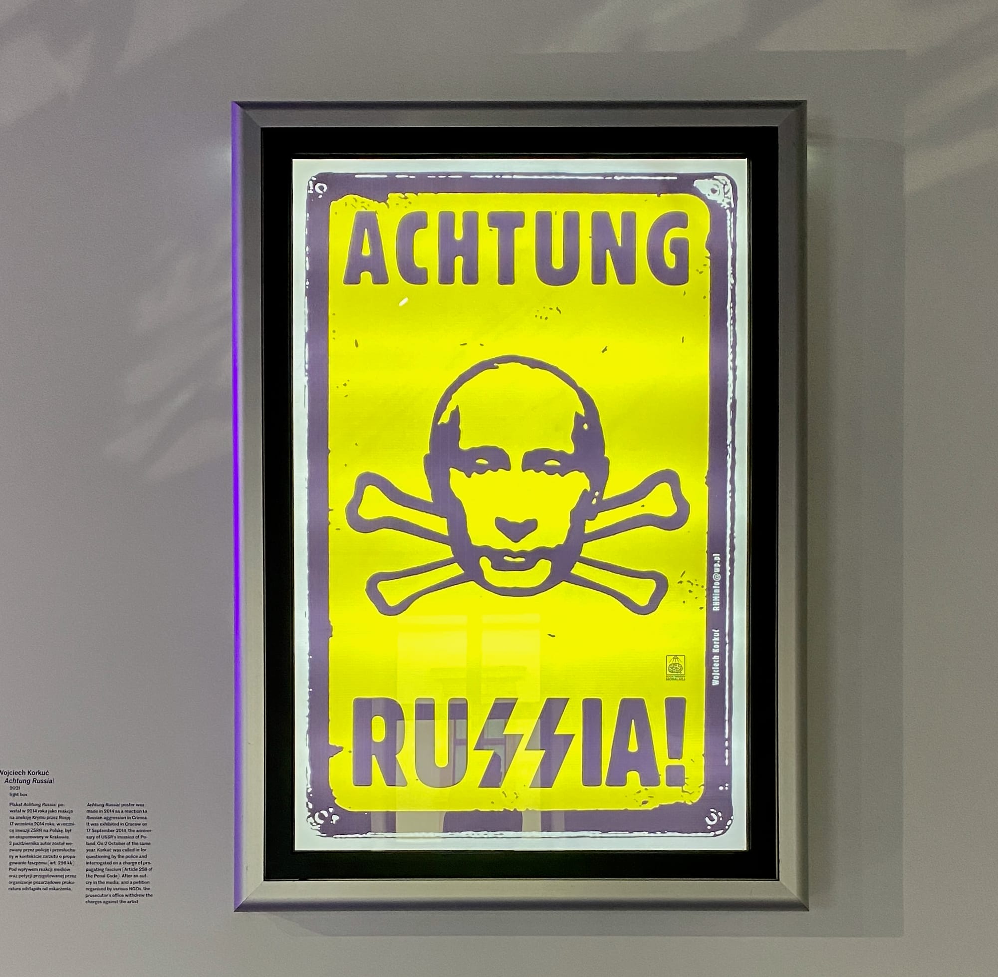 Wojciech Korkuc’s 2014 poster “Achtung Russia!” was created as direct response to Russia’s incursion into and partial annexation of Ukraine that year. Due to laws in some European countries like Poland and Germany, the use of Nazi symbols is heavily regulated and often banned. Artistic appropriation that does not promote these symbols is considered an exception to these laws. Korkuc’s use of the SS runic insignia led to questioning by police and to charges of “propagating fascism.” These charges against the artist were eventually dropped.