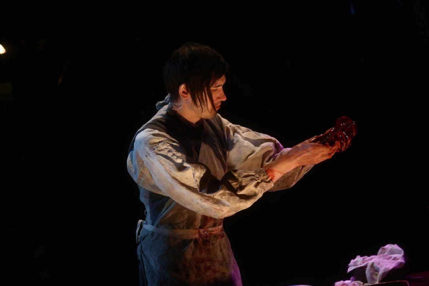 Yet Anatomy Theater never quite reaches an emotional peak, or consistent tone, ranging from necrophiliac humor (given a mad frenzy by Marc Kudisch as the anatomical theater ringmaster Joshua Crouch) to Southwell’s yearning aria of resurrection for her lost heart. It may have been opening night kinks, but Saturday’s performance had a curious temper shift from the audience enjoying complementary beer and sausages in the lobby (the twist being that, upon entering, you were partying at an execution), to the disorder of finding a seat while Osborne waited patiently on stage with the hangman. This may have worked more successfully in LA, as the scaffold was out in the lobby, from which the audience entered a theater to discover her body already on the dissecting table.