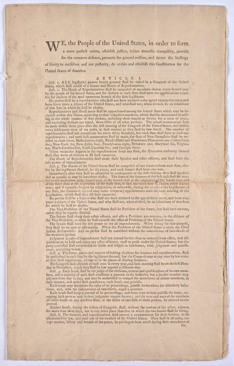 Selby Kiffer, an international senior specialist in books and manuscripts at Sotheby’s who also handled this Constitution’s last sale in 1988, estimates that this copy was among around 500 published at the same time. It was printed by hand by Philadelphia printers John Dunlap and David Claypoole, and Kiffer guesses that it was probably printed on the night of September 16, 1787. Totaling six pages in length, the document includes not only the text of the Constitution but also the roster of delegates who voted for the Constitution and the resolution accepting it. These print copies are remarkable not only for their “primacy” but also because they would have been produced for delegates like James Madison, Alexander Hamilton, and Benjamin Franklin.