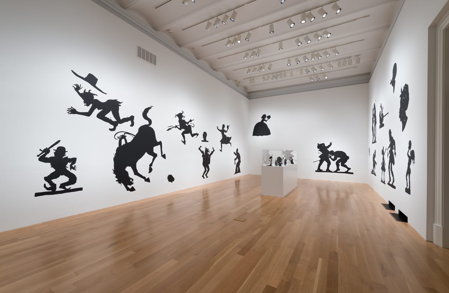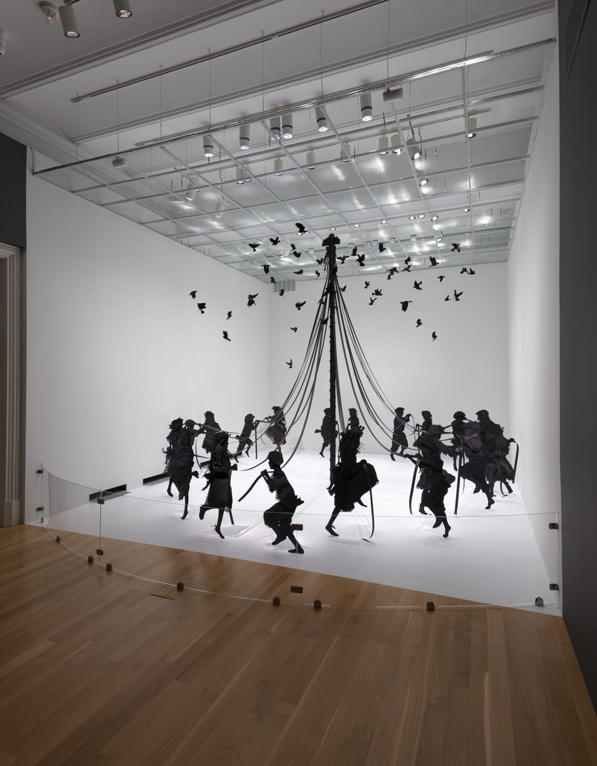 These historical objects represent the more fascinating half of Black Out, which also features works by four contemporary female artists in four separate galleries. On view are large-scale paper installations by, of course, Kara Walker, the most well-known artist today working with silhouettes, which explicitly wrestle with slavery through her characteristically violent scenes. They contrast starkly with a massive, intricate installation by Kristi Malakoff comprising playful cutouts of an 18-foot-tall maypole and life-size children who dance around it.