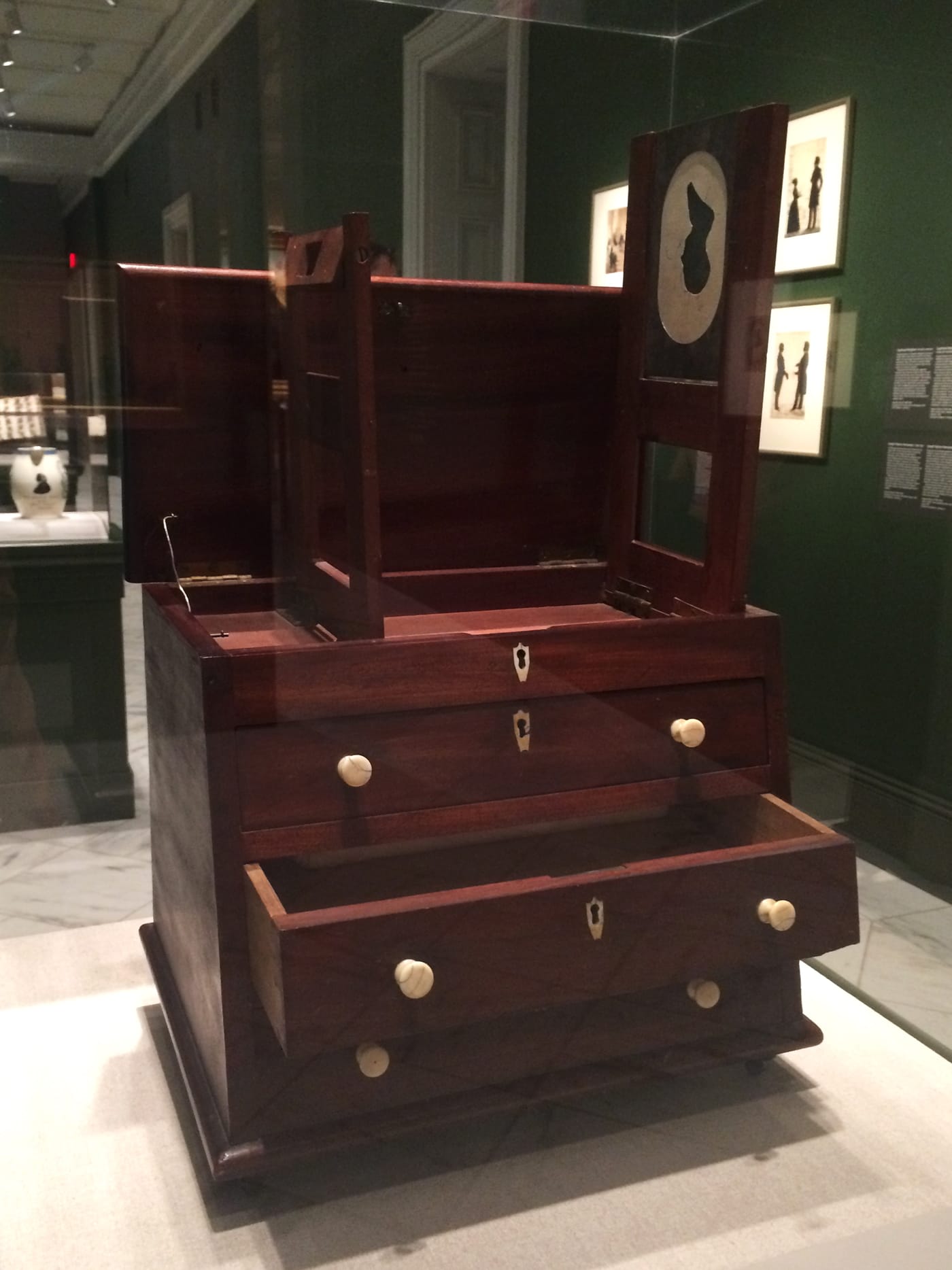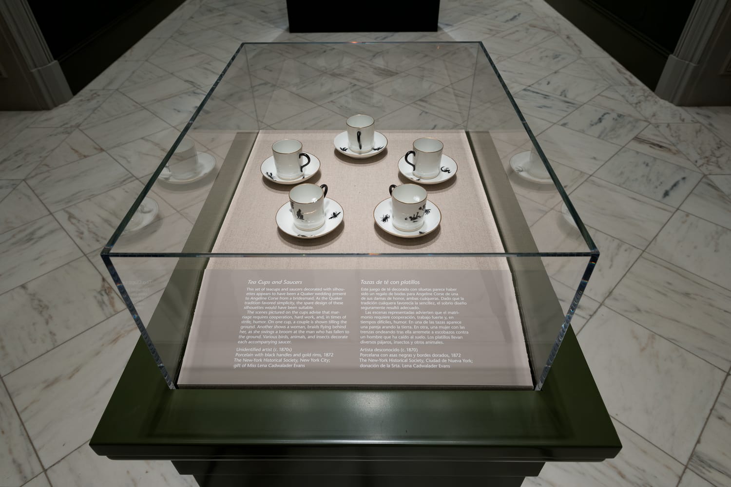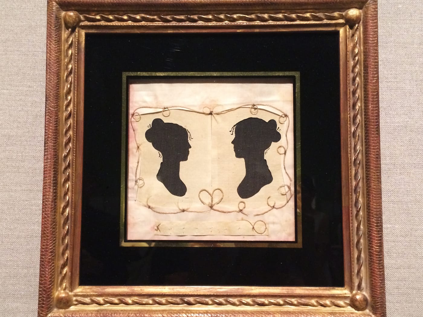 Like Drake and Bryant’s shared portrait, the vast majority of silhouettes on view are paper cutouts (the show also features relics like a decorated jug and tea set). These were often produced, beginning in the late 18th-century, with a cutting instrument known as a physiognotrace, which traced a person’s profile within minutes. Such speed, coupled with the low-cost of having one’s picture made, meant that this form of portraiture was incredibly accessible to nearly anybody from all walks of life (unlike oil paintings); by the 1780s, silhouettes proved highly popular in America, and, as Naeem argues, democratized portraiture long before the advent of photography.