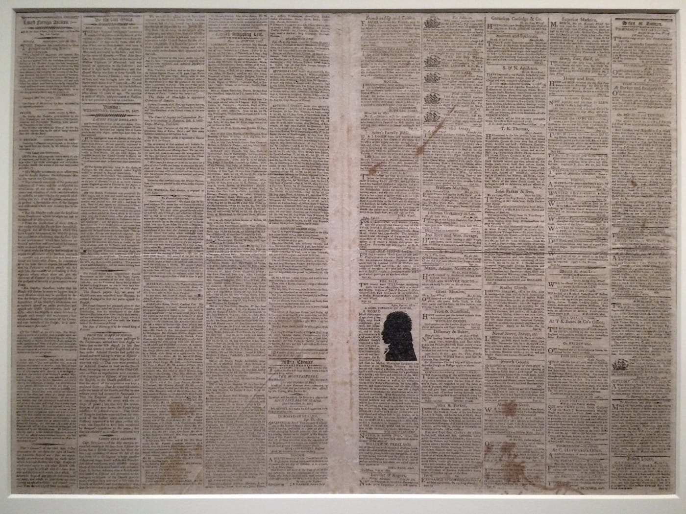 The oldest object on view also documents an ugly reality, showing on brown paperboard one of the earliest known images of a slave in the United States, accompanied by a bill of sale. The life-sized portrait depicts a 19-year-old girl named Flora, who was bought for 25 pound sterling in 1796. Unlike Edouart’s later images, this one was purely functional, intended to catalogue human property; it is similar to a 1807 newspaper ad that hangs nearby and features a bold silhouette of a runaway slave known as “Sancho.” Writing in the exhibition catalogue, Naeem describes how the blackness of the historical silhouette functioned differently for white versus black sitters: