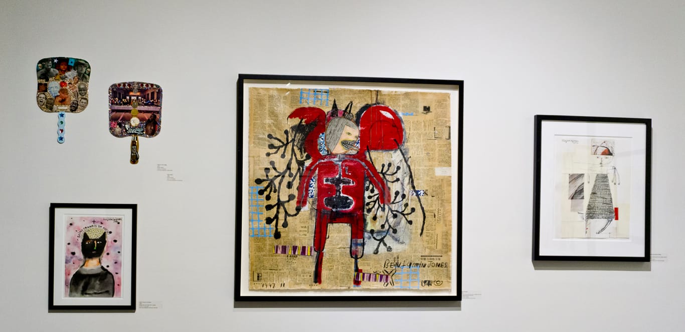 As his work developed over the years, Jones began including other figures, as well as animals and collage elements culled from his voluminous notebook and ephemera collection. Many of these private source materials are on display in the exhibition. Color, used minimally in the early work, later became a central element in his images. The transitions between his early and later works echo a life-stage metamorphosis, and indeed this is redoubled in Jones’s autobiography: After a hiatus of several years, when he tended to his ill mother and dealt with his own health issues, Jones came roaring back to the studio, almost reborn.