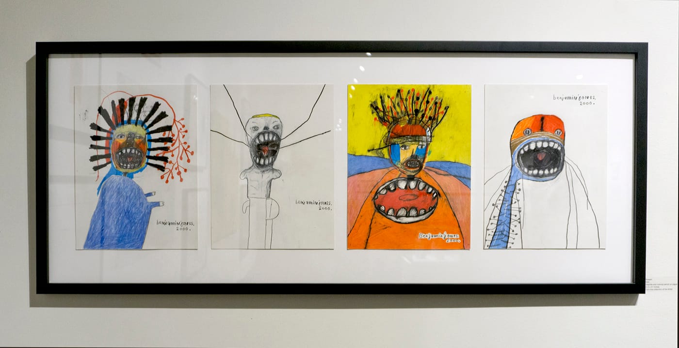 Born in 1954 in Atlanta, Jones faced many challenges in his life. Called “sissy boy” as a child, he started drawing at a young age and channeled many of his internal (and outside) demons into his artwork. His early drawings often feature a solitary central figure (possibly the artist himself) who seems both put upon by the world and is screaming back at it. The artist’s name, written in an idiosyncratic script, is always prominent in these compositions, as if to declare his existence and his value. The work projects deep sorrow as well as an unvanquished ray of optimism.