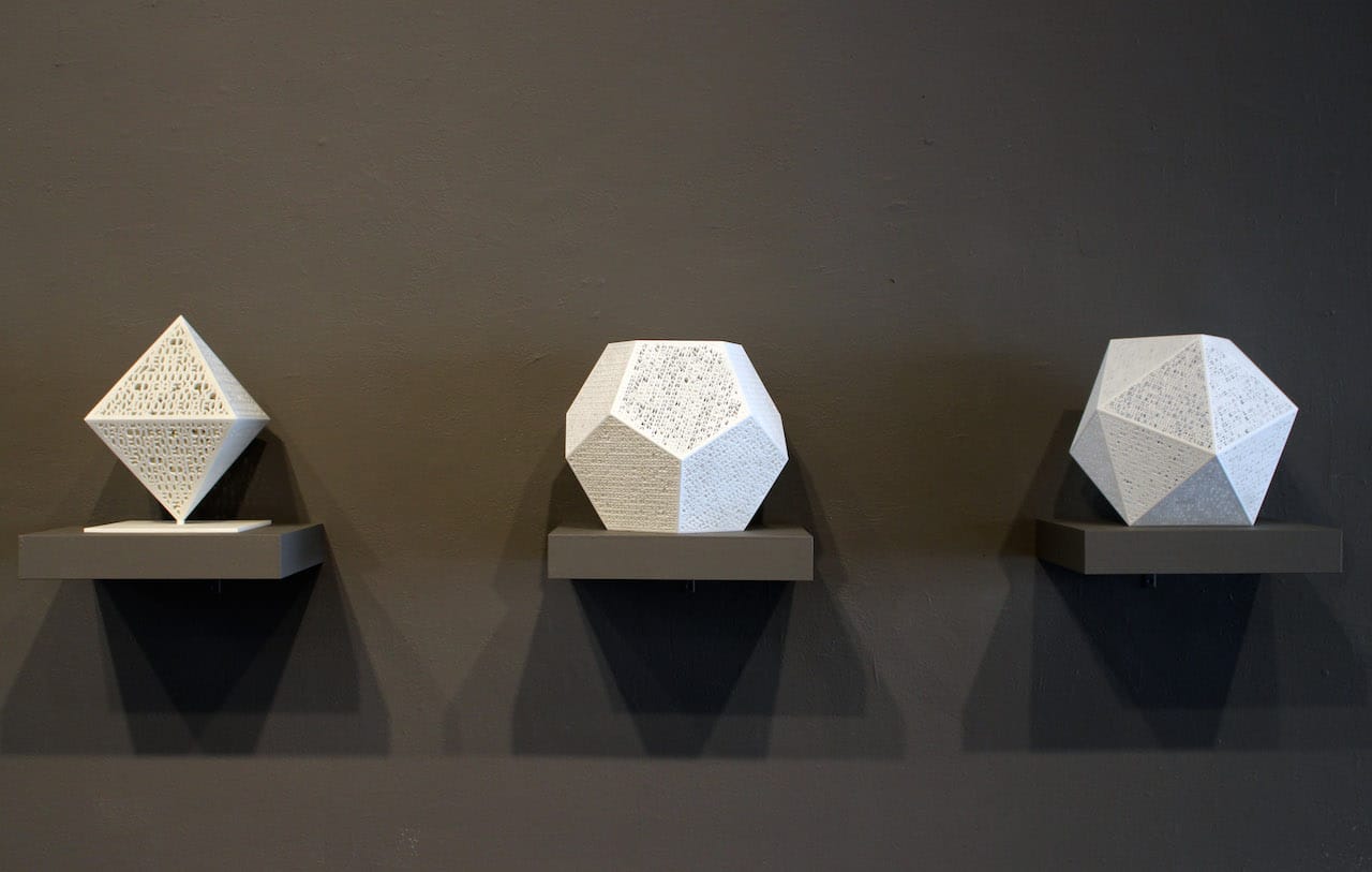 From left to right: Ashley Zelinskie, “Octahedron” (2014); “Dodecahedron” (2015); “Icosahedron” (2015), all 3-D printed nylon, various sizes